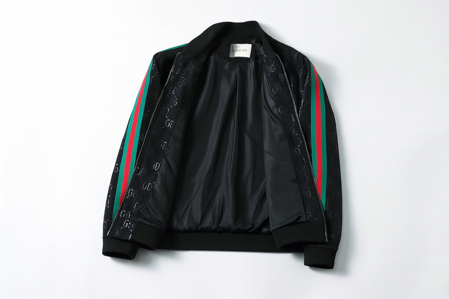 The design is accentuated by the brand’s signature green and red web stripes running along the sleeves, symbolizing Gucci’s heritage and instantly recognizable aesthetic. The lightweight satin finish fabric provides a subtle sheen, while the ribbed cuffs, collar, and hem ensure a comfortable, tailored fit.