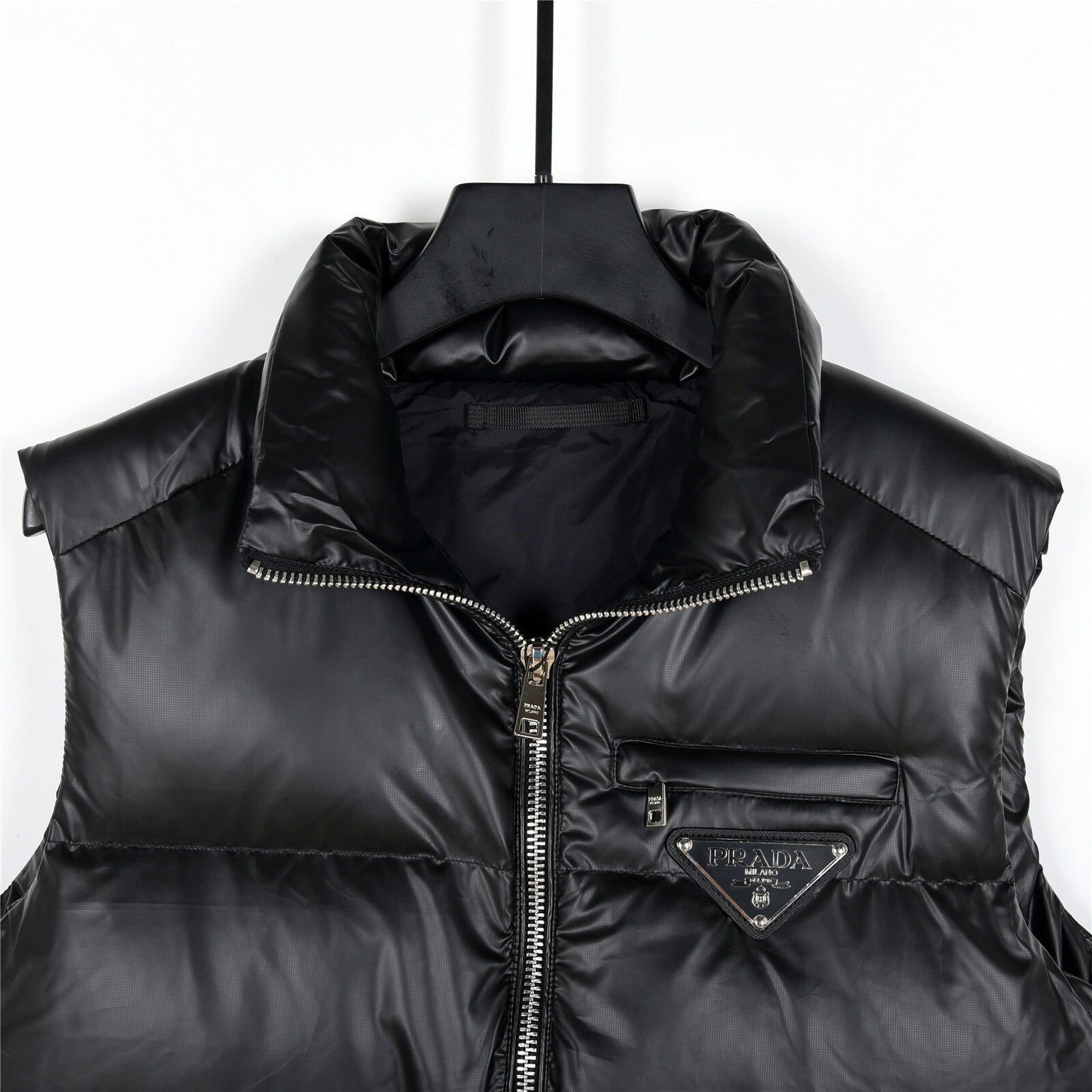 Designed with precision, it showcases the iconic Prada triangle logo on the chest, oversized zip pockets, and a refined high-neck silhouette — effortlessly merging function with fashion.