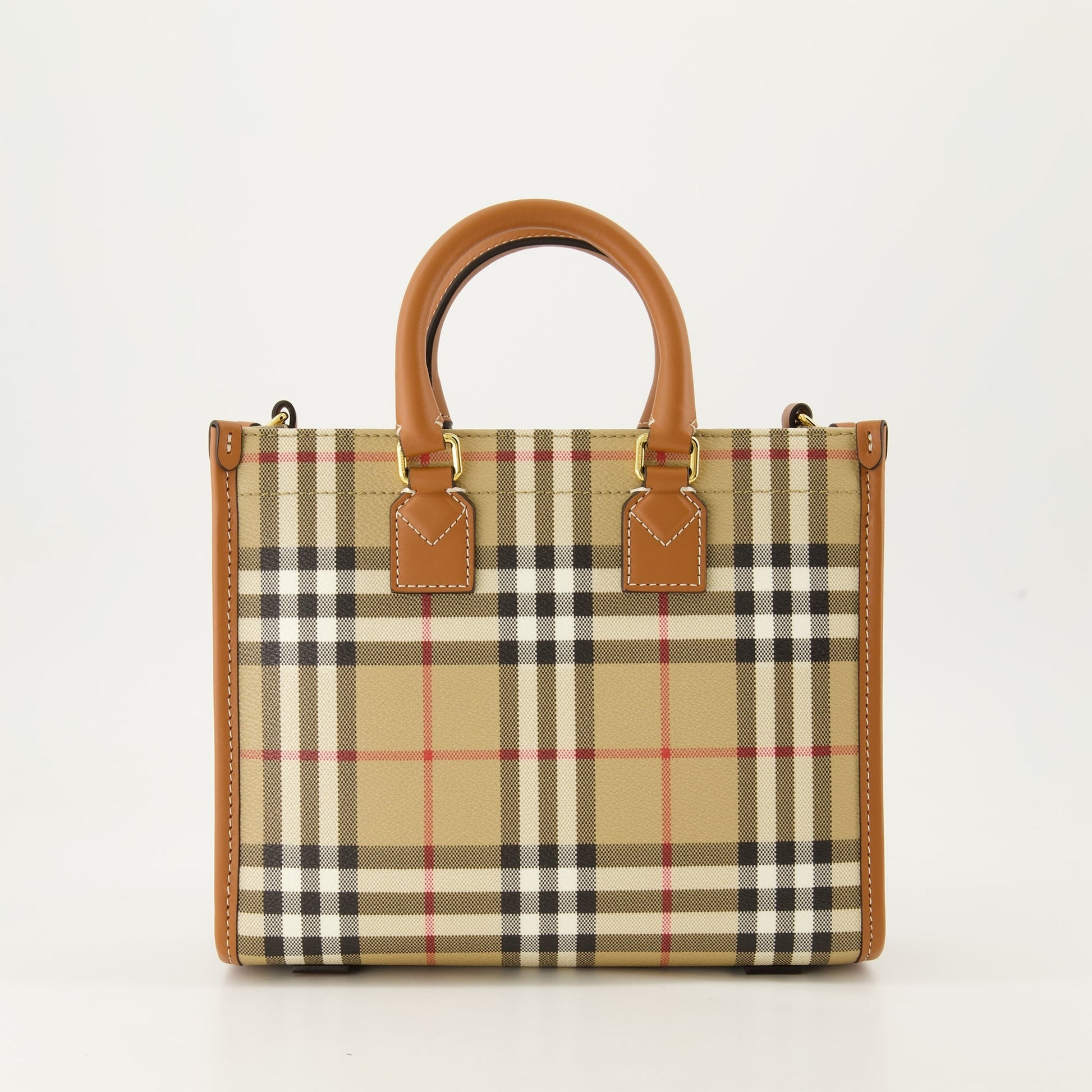 Mini cabas Freya from the Burberry Autumn-Winter 2024 collection for Women. Made of embroidered canvas and leather. Vintage check printed item. Adjustable and detachable shoulder strap and fixed handles.