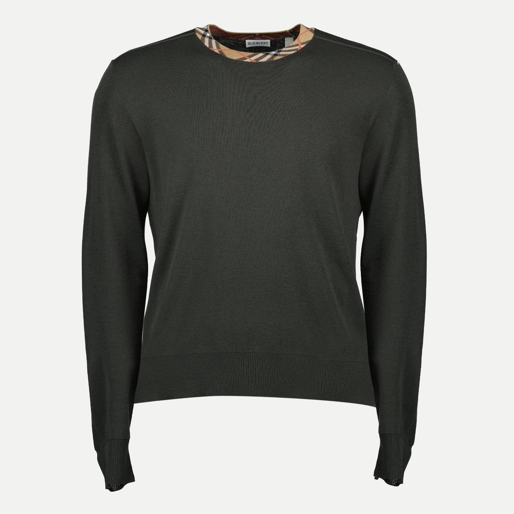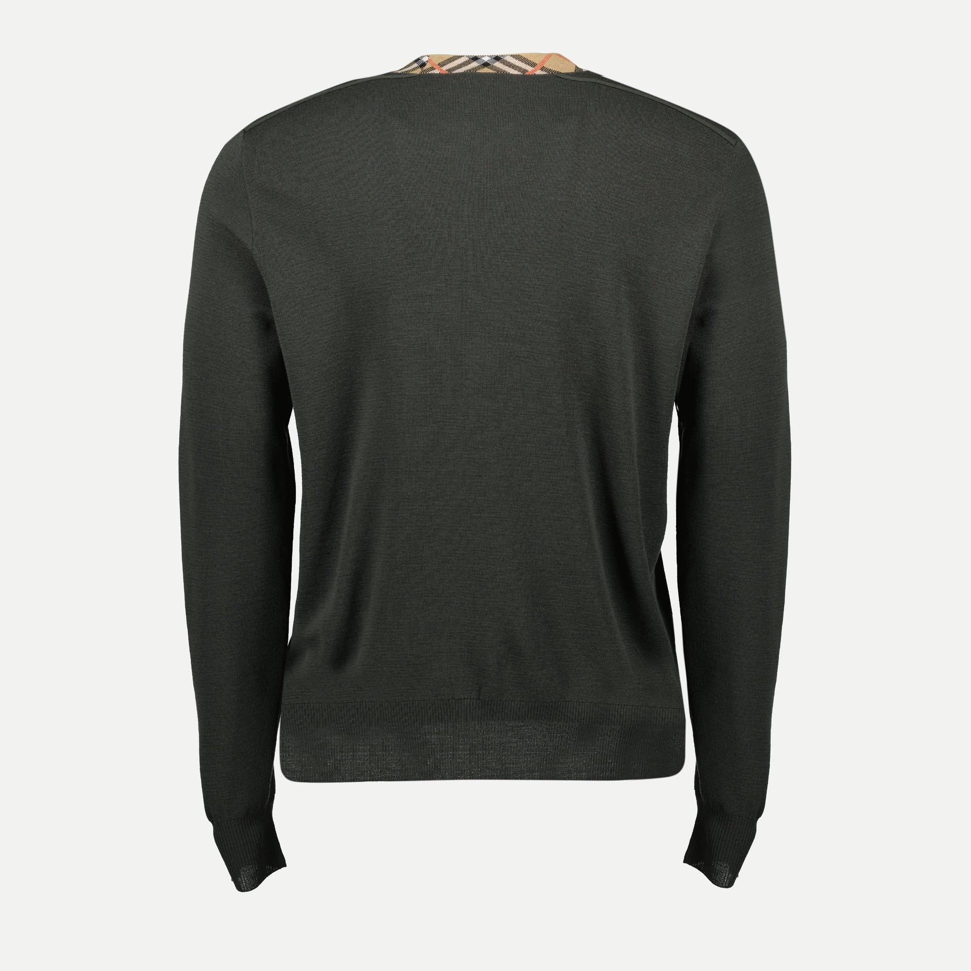 Kaki wool sweater from Burberry for men. This model is part of the Autumn-Winter 2025 collection and features a round neck with Check plaid detail.