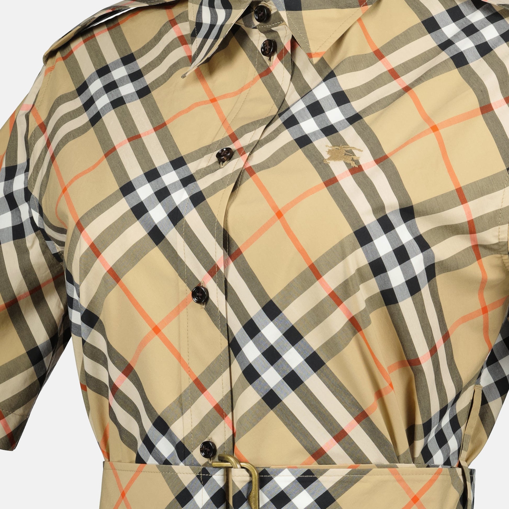 Beige Check shirt dress by Burberry, designed for women. Part of the Autumn-Winter 2025 collection, it features a plaid print and elegant details.