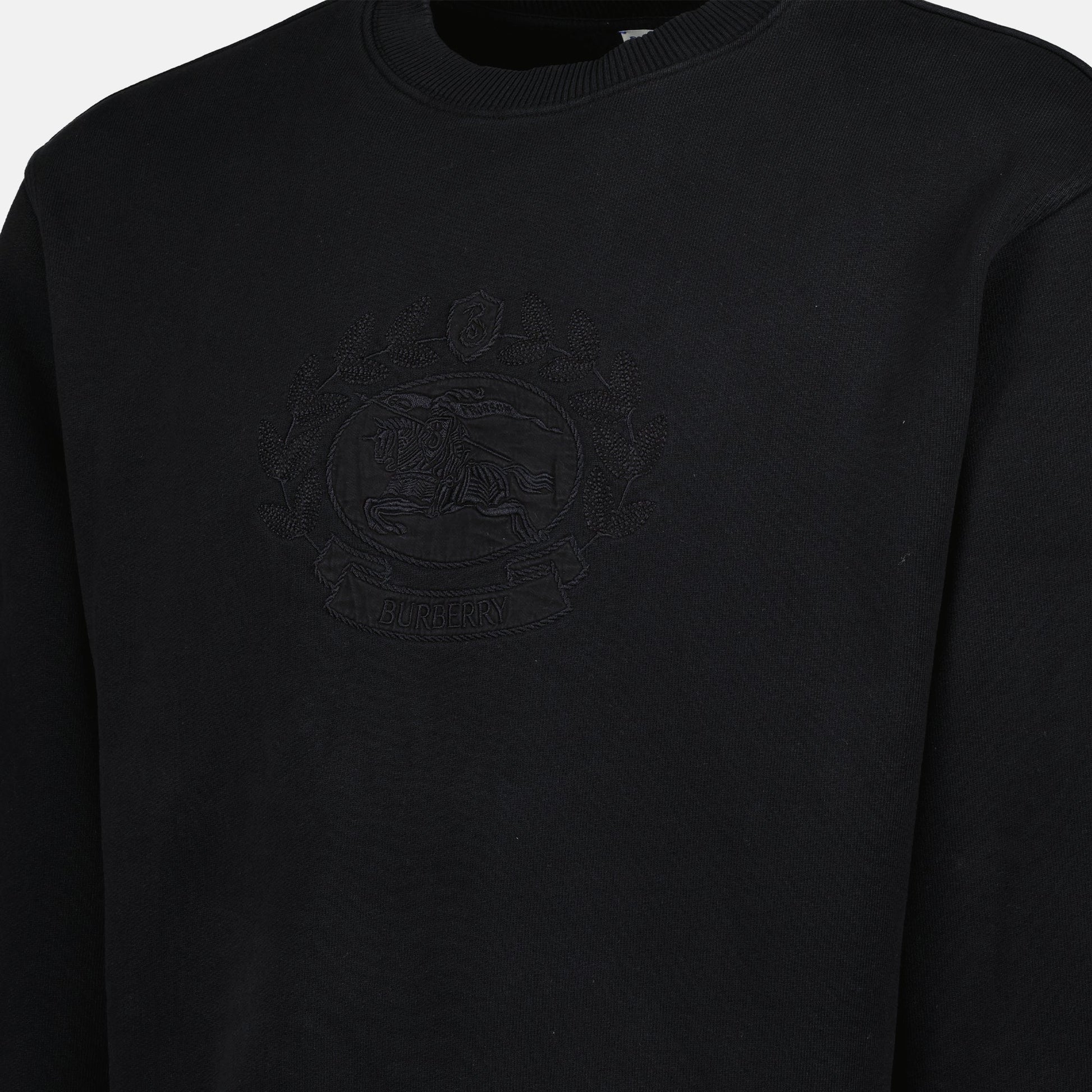 Black Burberry sweatshirt for men from the Autumn-Winter 2024 collection. It features a round neck, long sleeves, and an embroidered logo on the chest in khaki green.