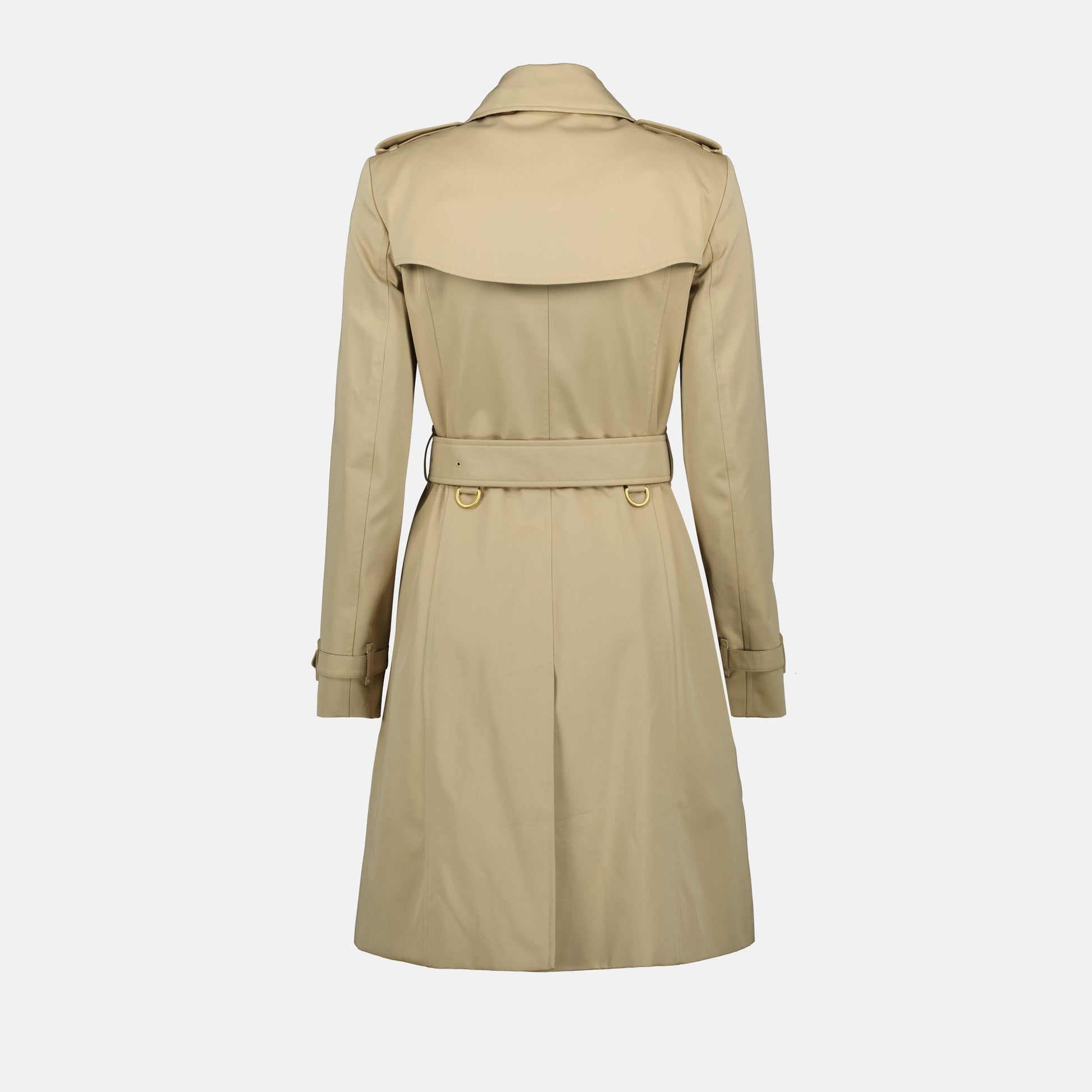 The iconic Chelsea long trench coat by Burberry is a women's garment from the Spring-Summer 2025 collection. Made of beige cotton, it features a long cut and elegant details.