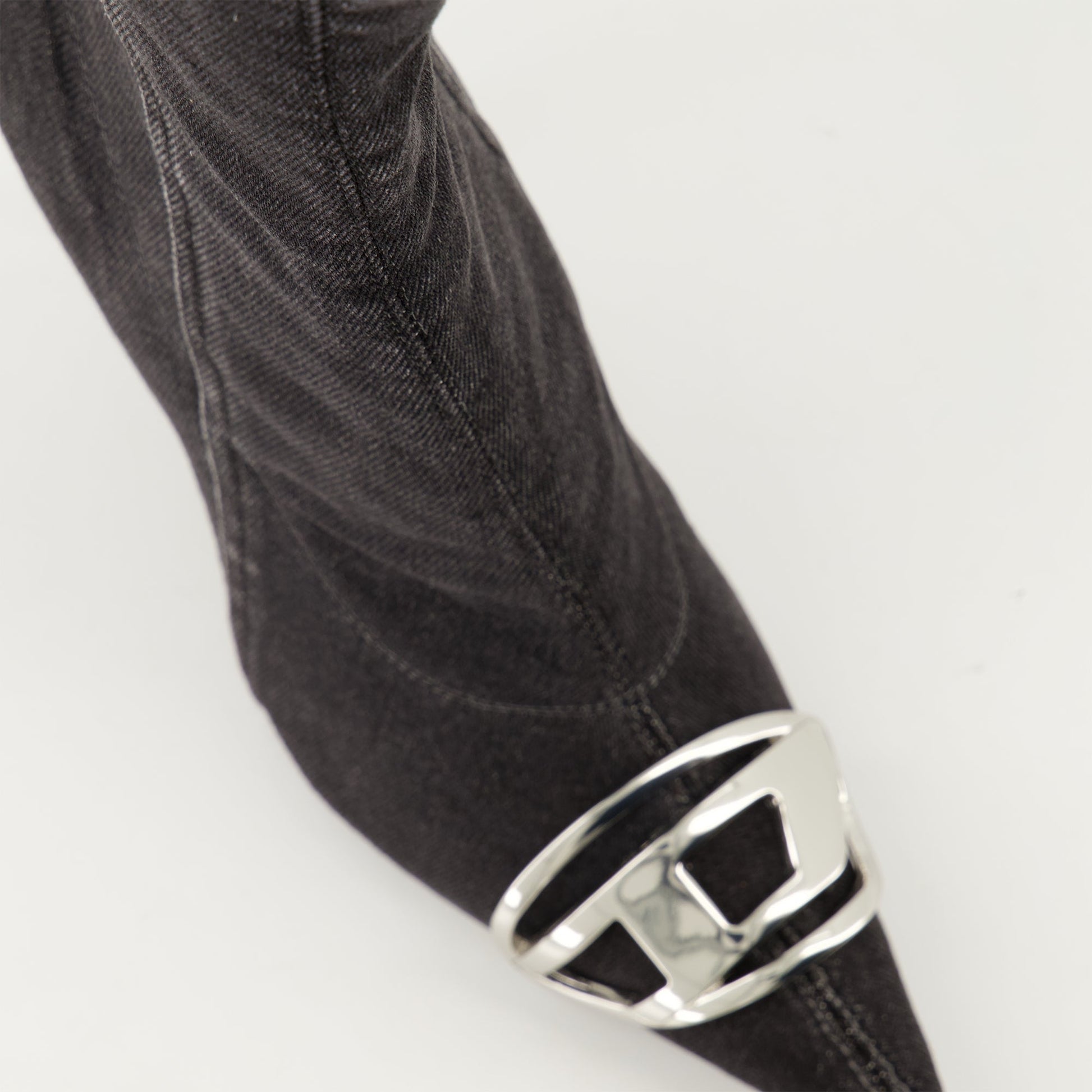 Venus boots from Diesel's Autumn-Winter 2024 collection for Women. Made from denim. Item Color: gray. Pointed toe and leather sole.