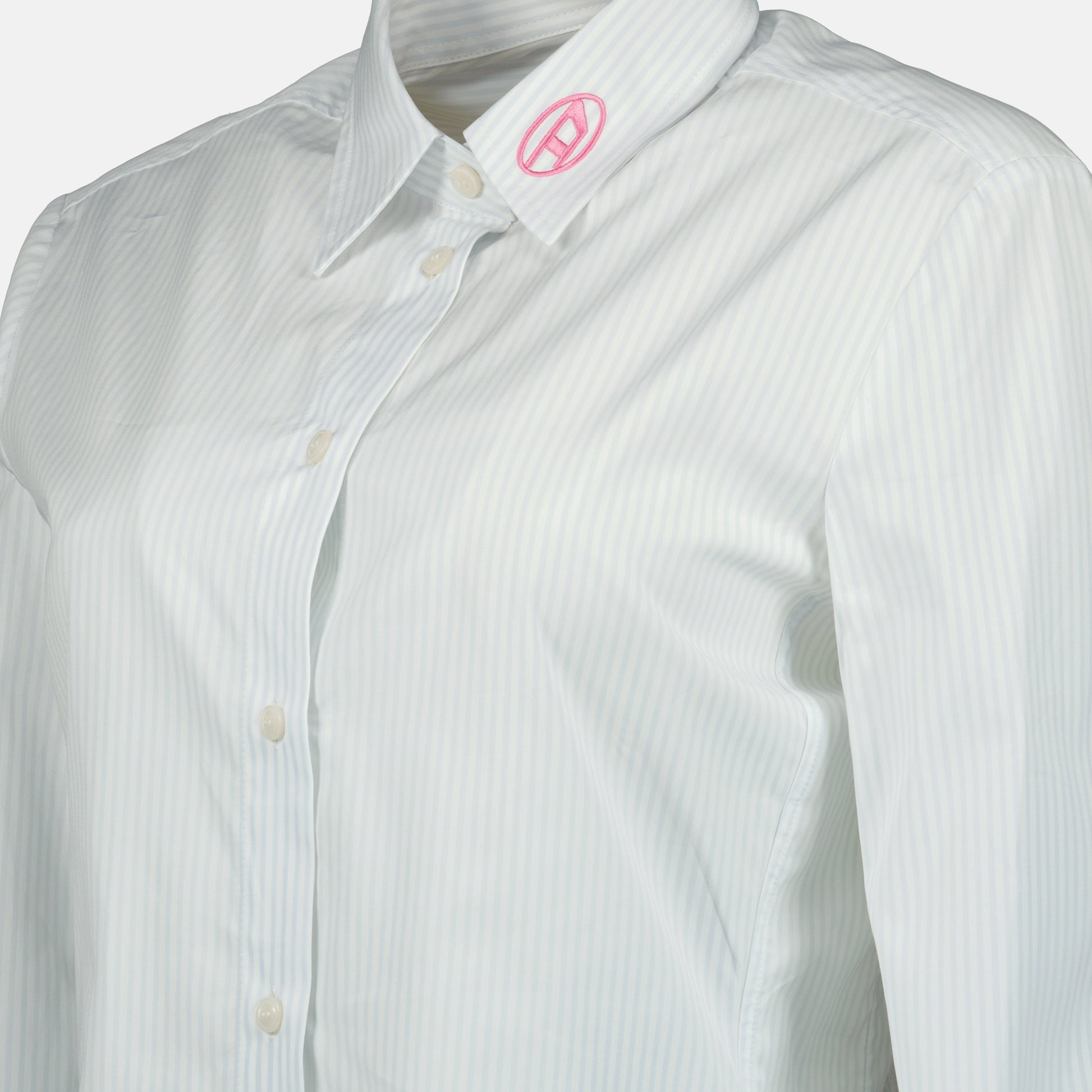 The C-Gisel white striped shirt from Diesel is a feminine piece from the Spring-Summer 2025 collection. It is made of cotton with a classic collar and a striped pattern.