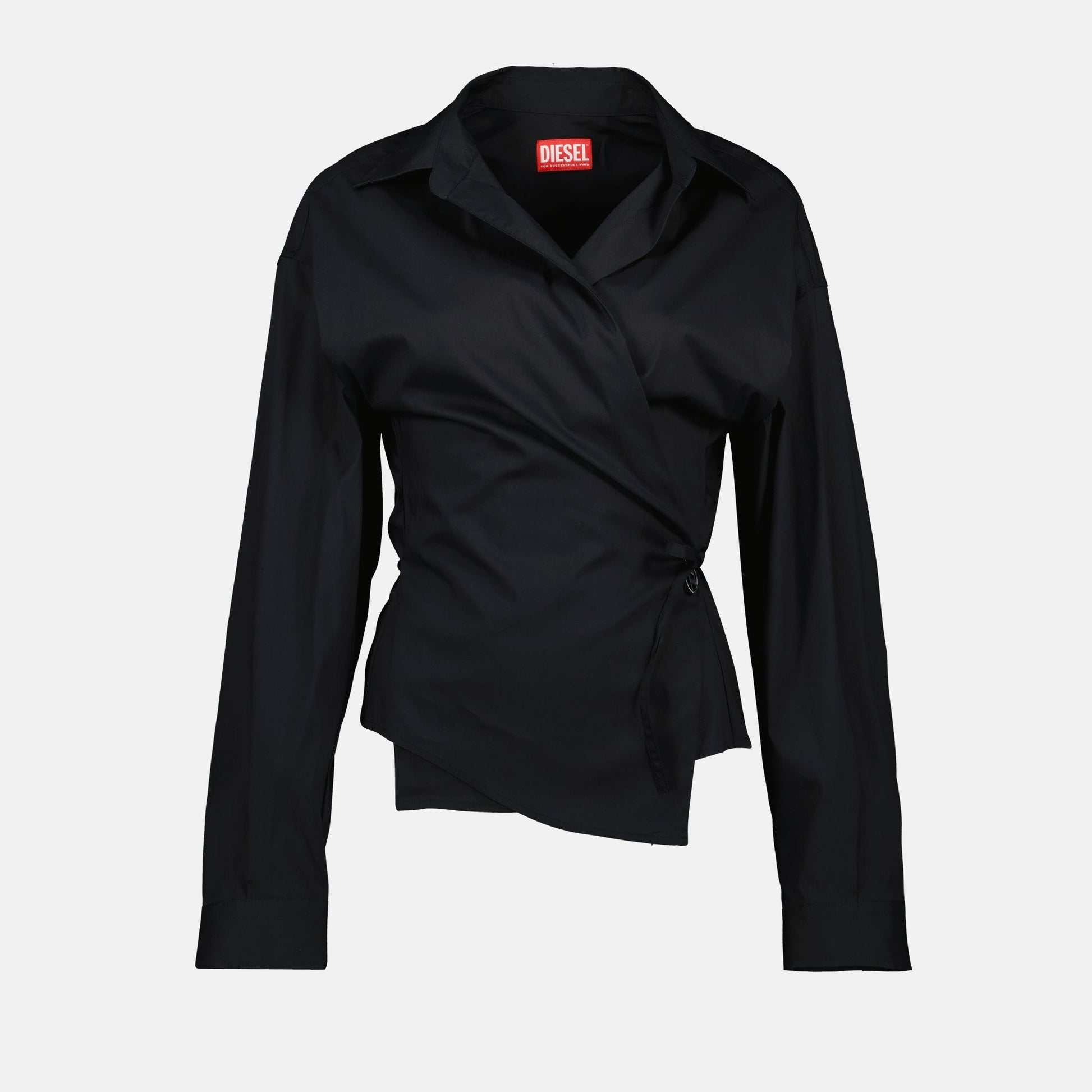 The black V-Delphi shirt from Diesel is a feminine piece from the Spring-Summer 2025 collection. It is made of poplin with a V-neck and a fitted cut.