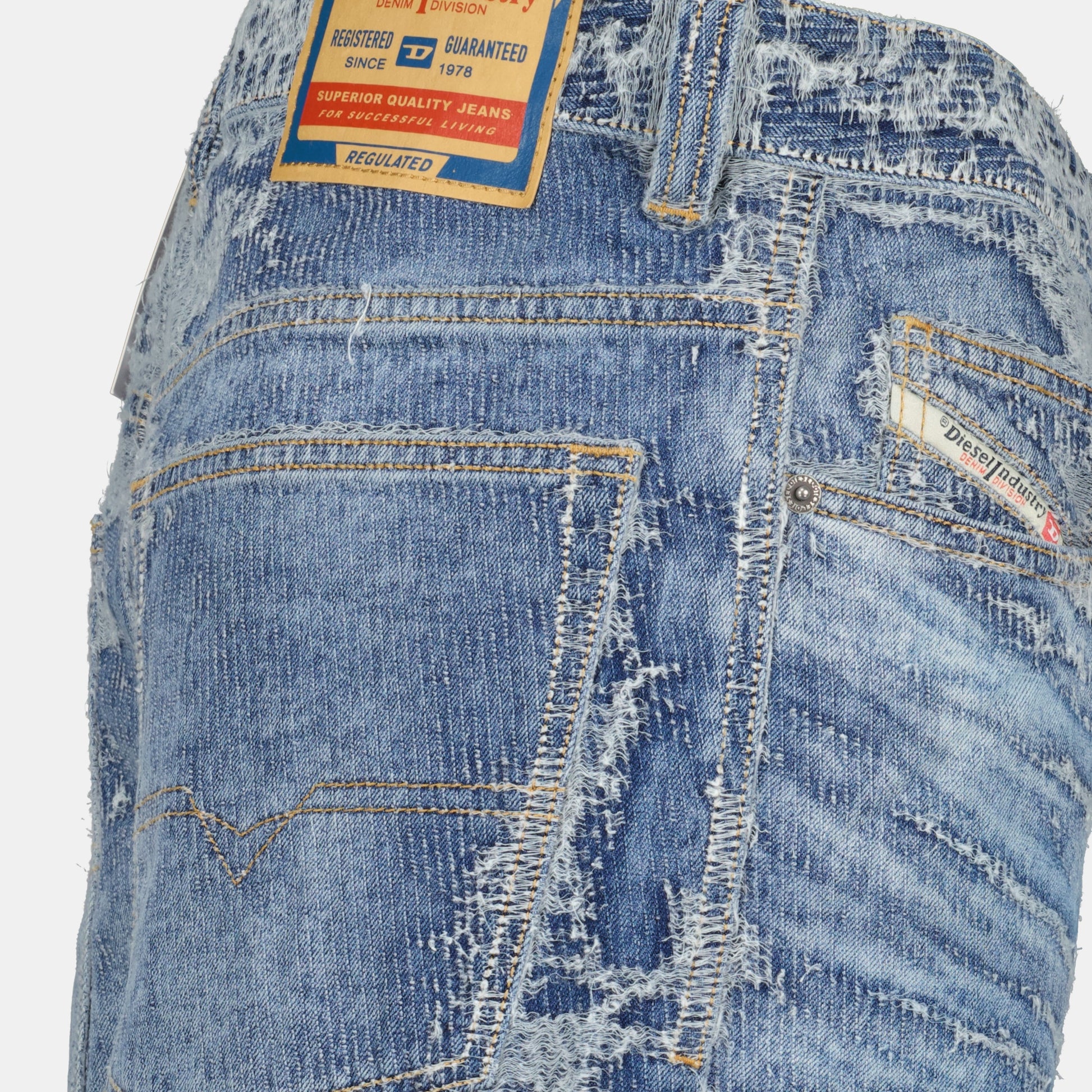 2001 D-macro jeans in faded blue denim from the brand Diesel, for men. This model is part of the Spring-Summer 2025 collection with a loose fit and a worn effect.