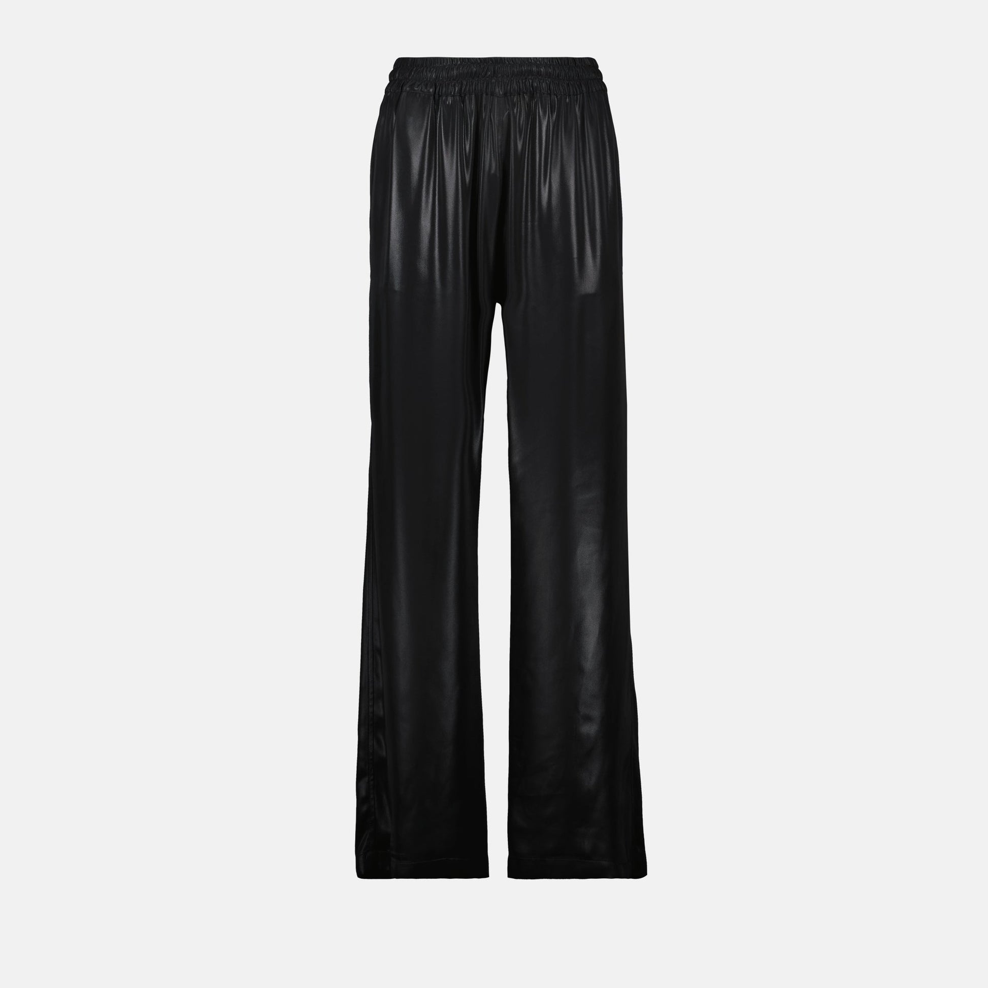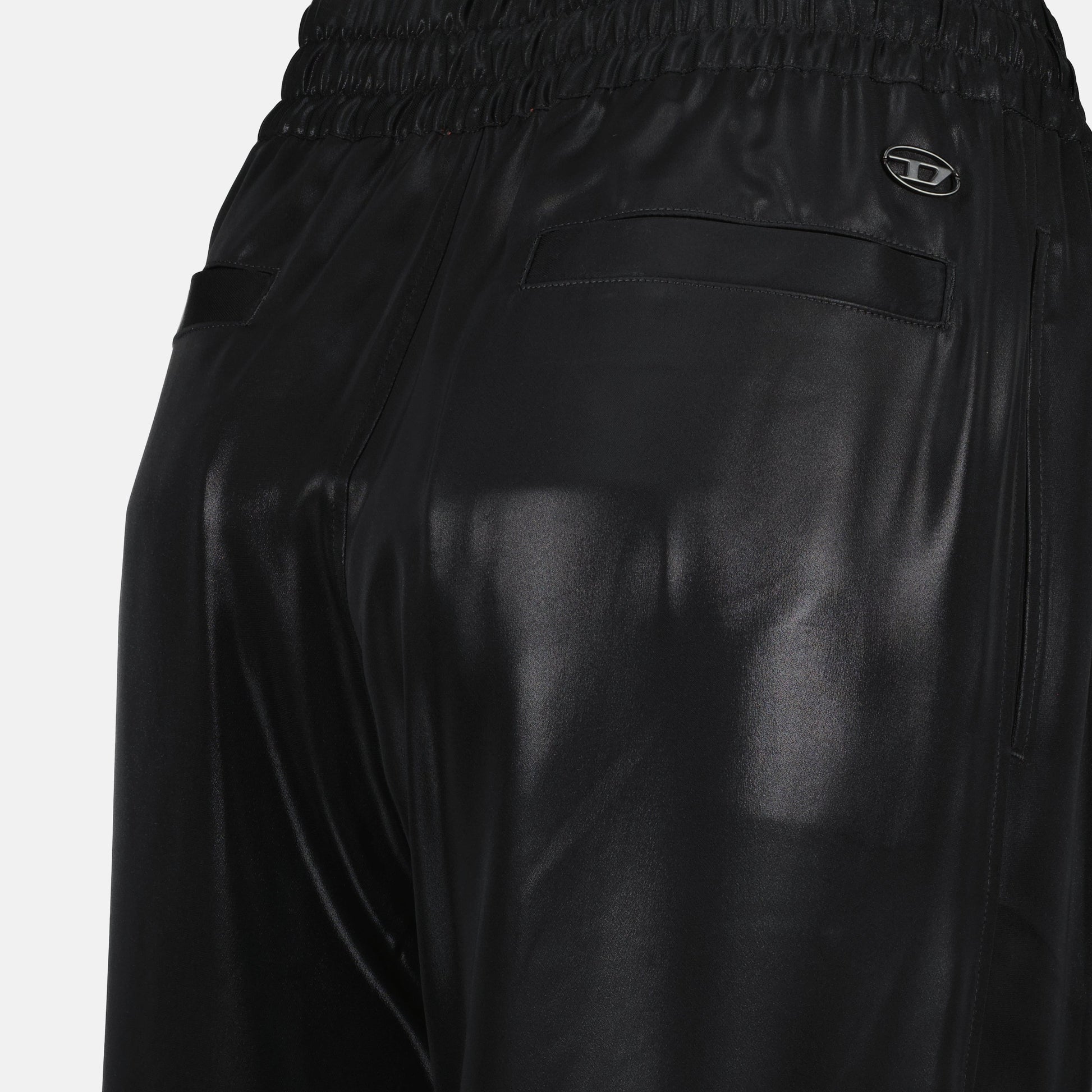 Fluid black P-Dreyer pants from the brand Diesel for women. This model is part of the Spring-Summer 2025 collection and features a metallic and shiny finish.