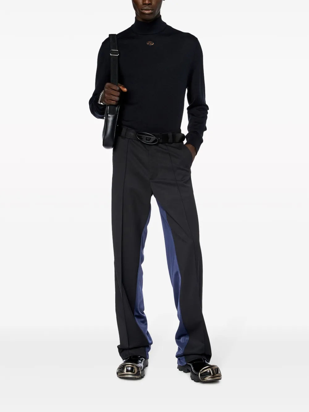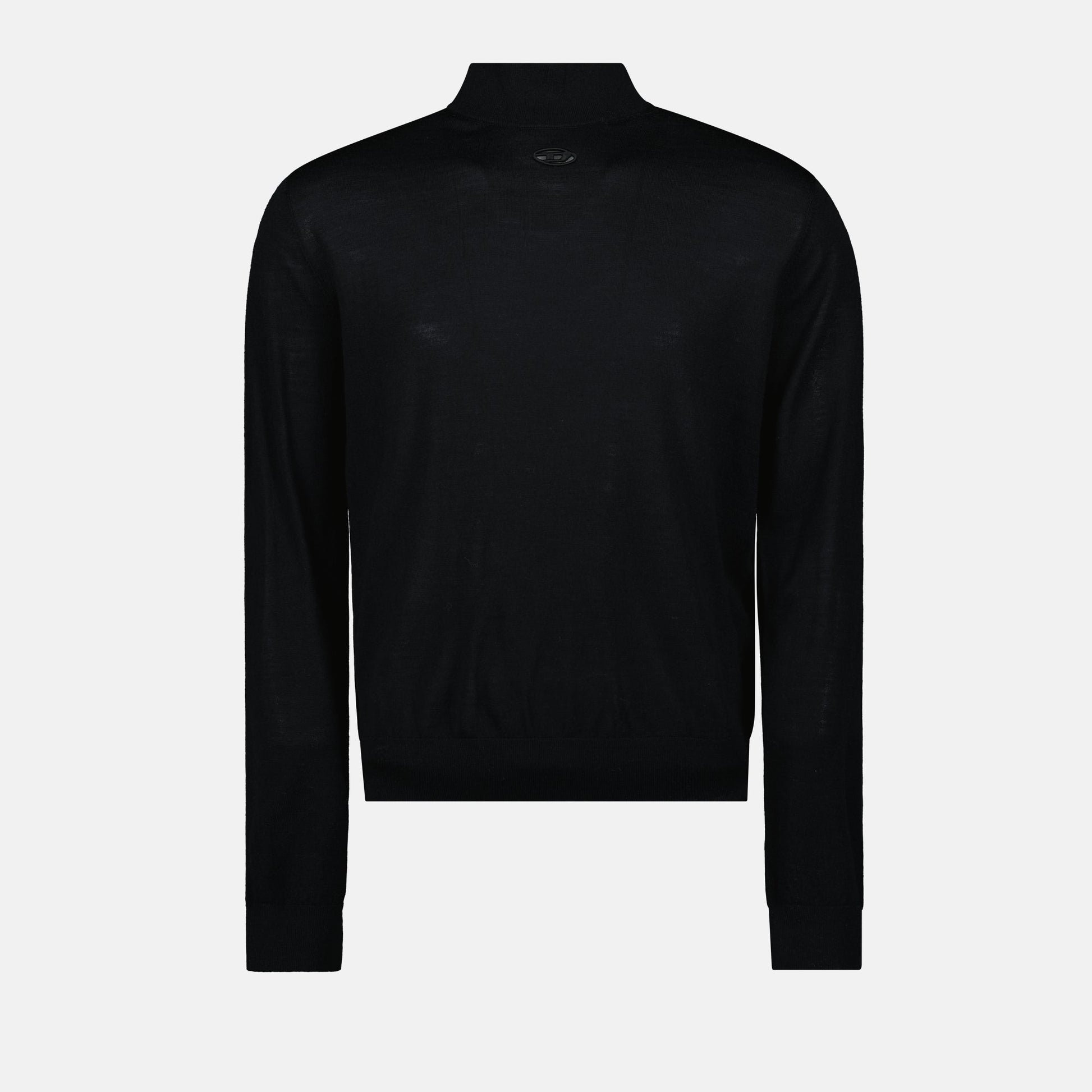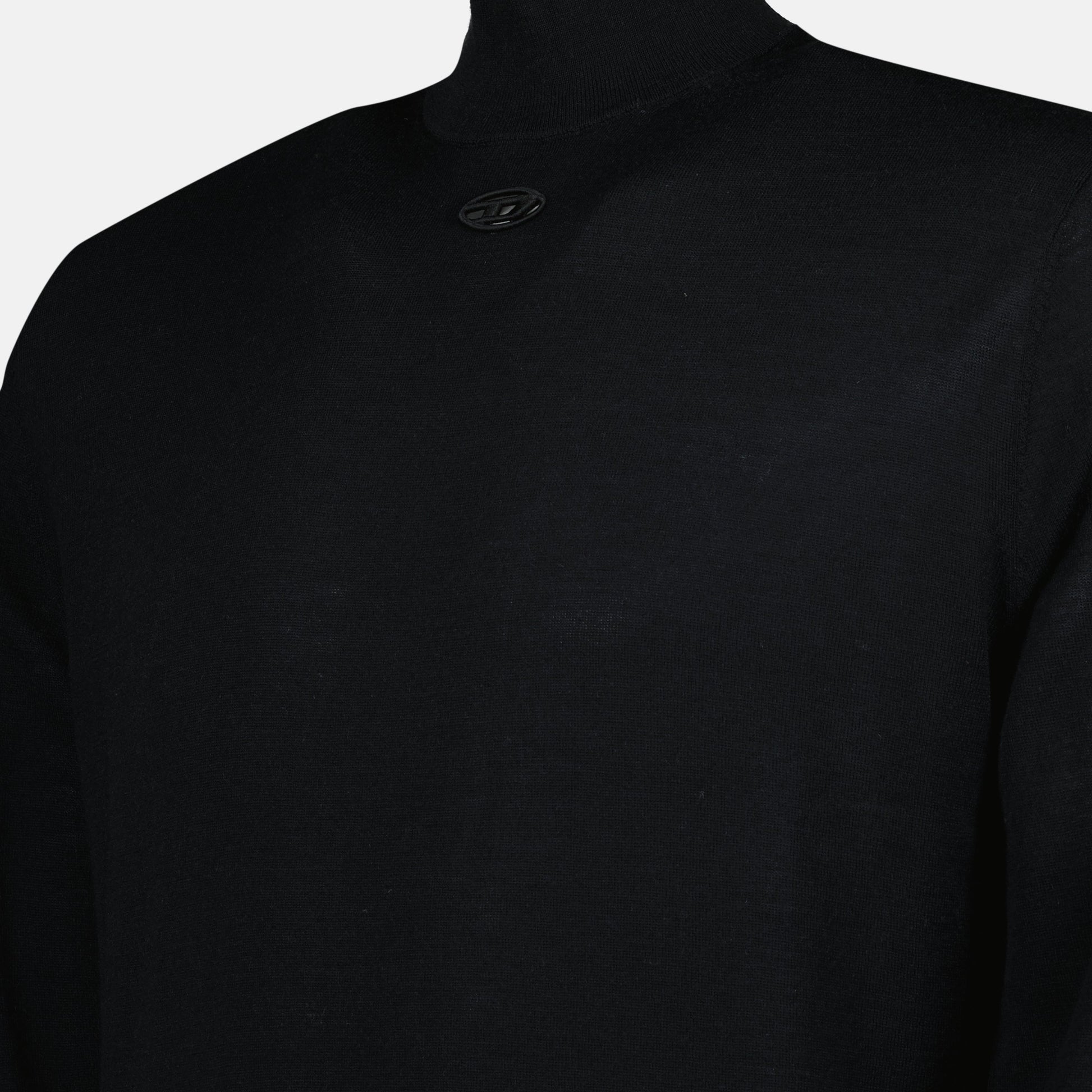 Black wool turtleneck sweater from the brand Diesel, designed for men. This model is part of the Autumn-Winter 2024 collection and features a distinctive embroidered logo.