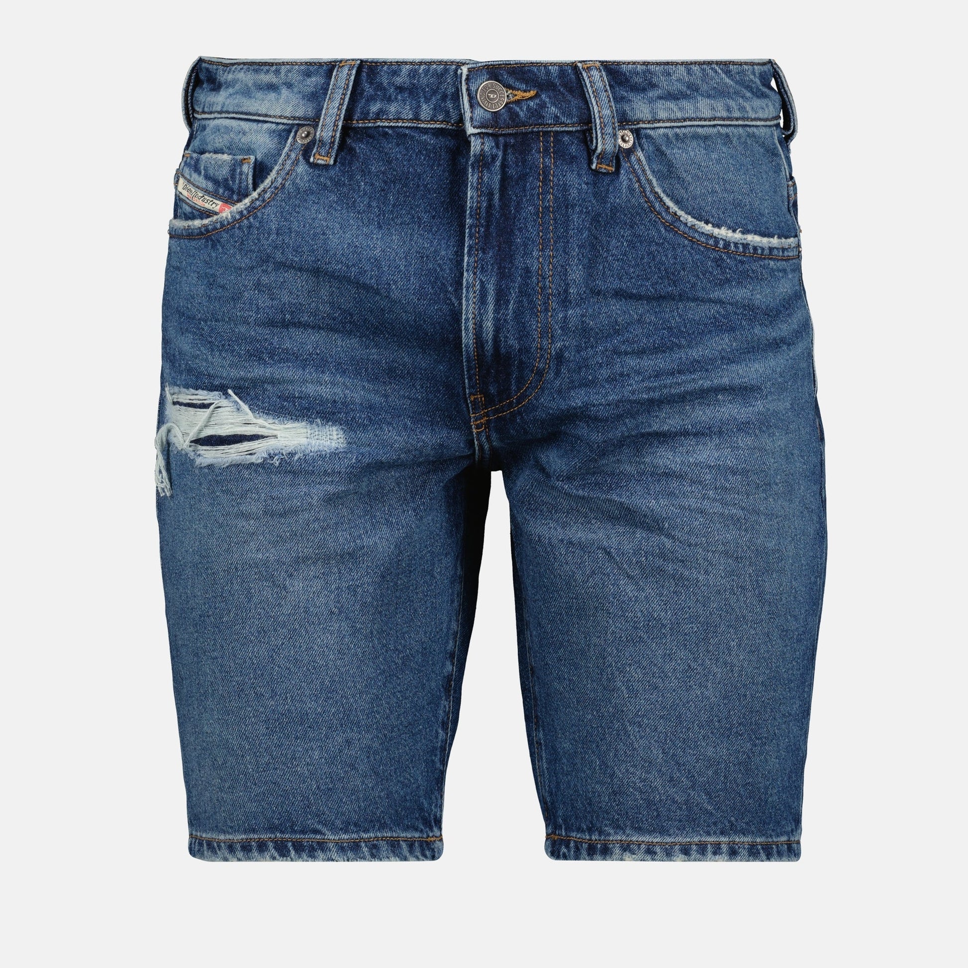 D-Fin blue denim shorts from the brand Diesel, designed for men, from the Spring-Summer 2025 collection. It features a straight cut, a worn effect, and a five-pocket design.