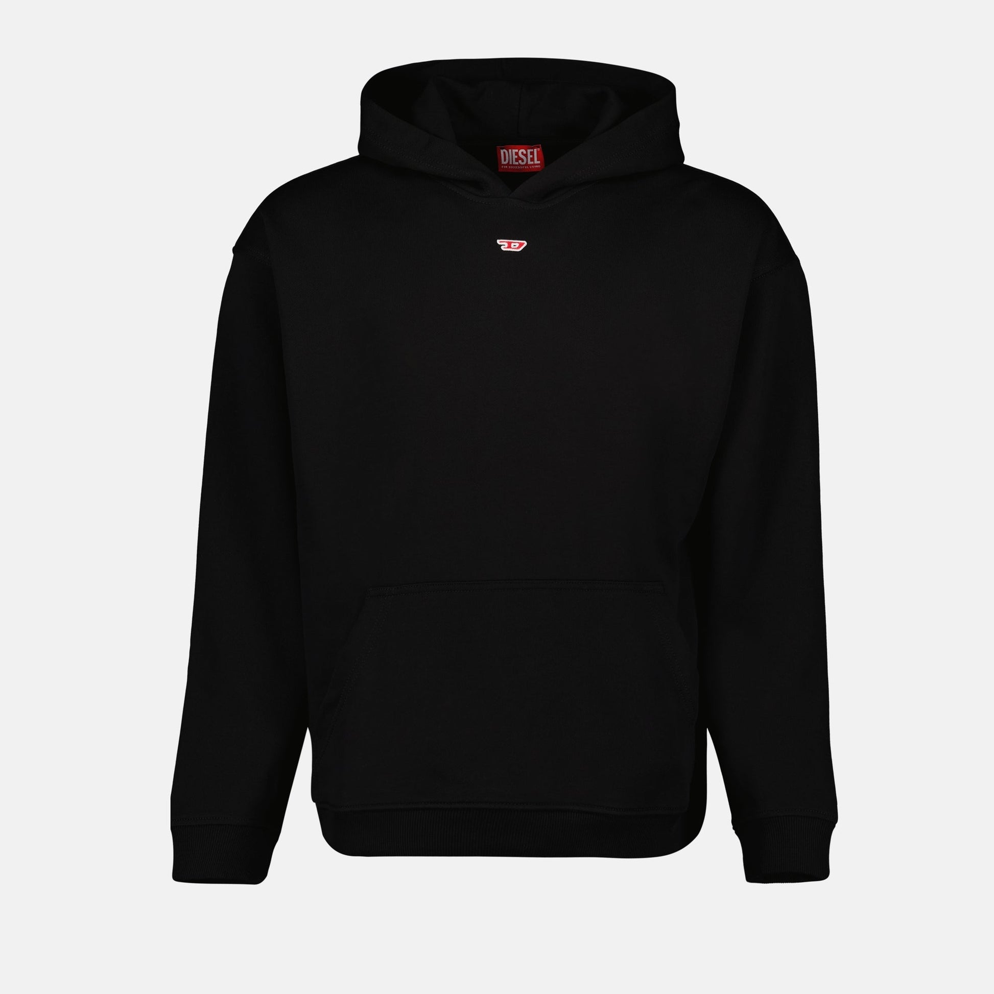 S-Boxt-Hood-D hooded sweatshirt from the Diesel Autumn-Winter 2024 collection for Men. Made from cotton and elastane. Black color and long sleeves.