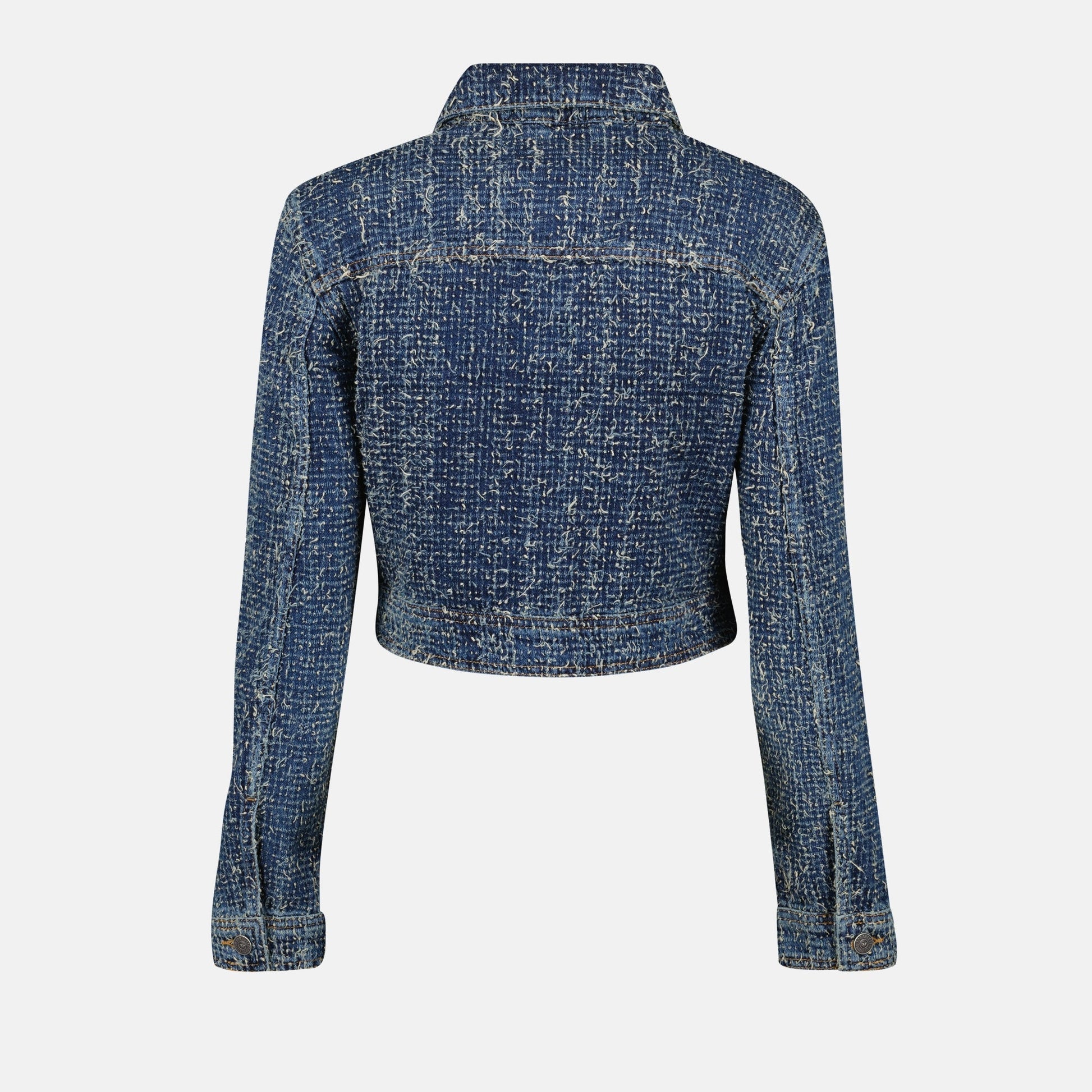 De-Atel-S denim jacket from the Diesel Autumn-Winter 2024 collection for women. Made of denim. Item in Blue color. Classic collar and Long sleeves.