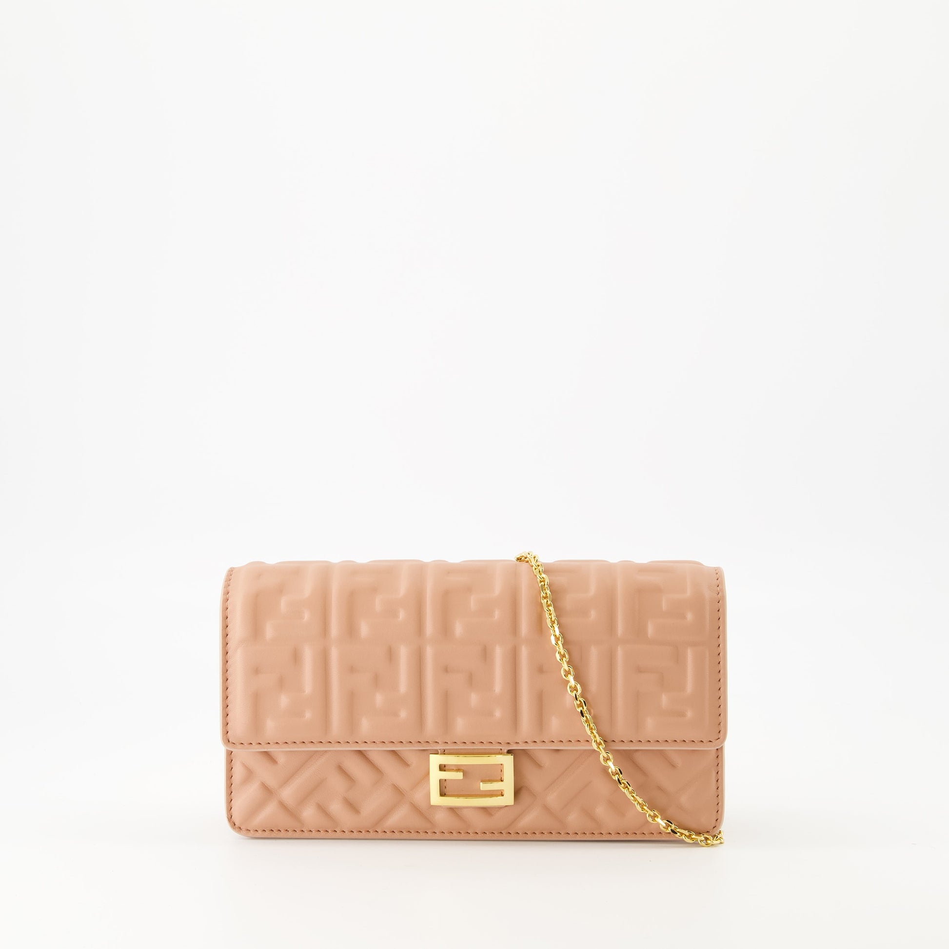 Baguette Wallet with pink chain from Fendi for women, made of nappa leather with an embossed FF pattern. This model is part of the Spring-Summer 2025 collection.