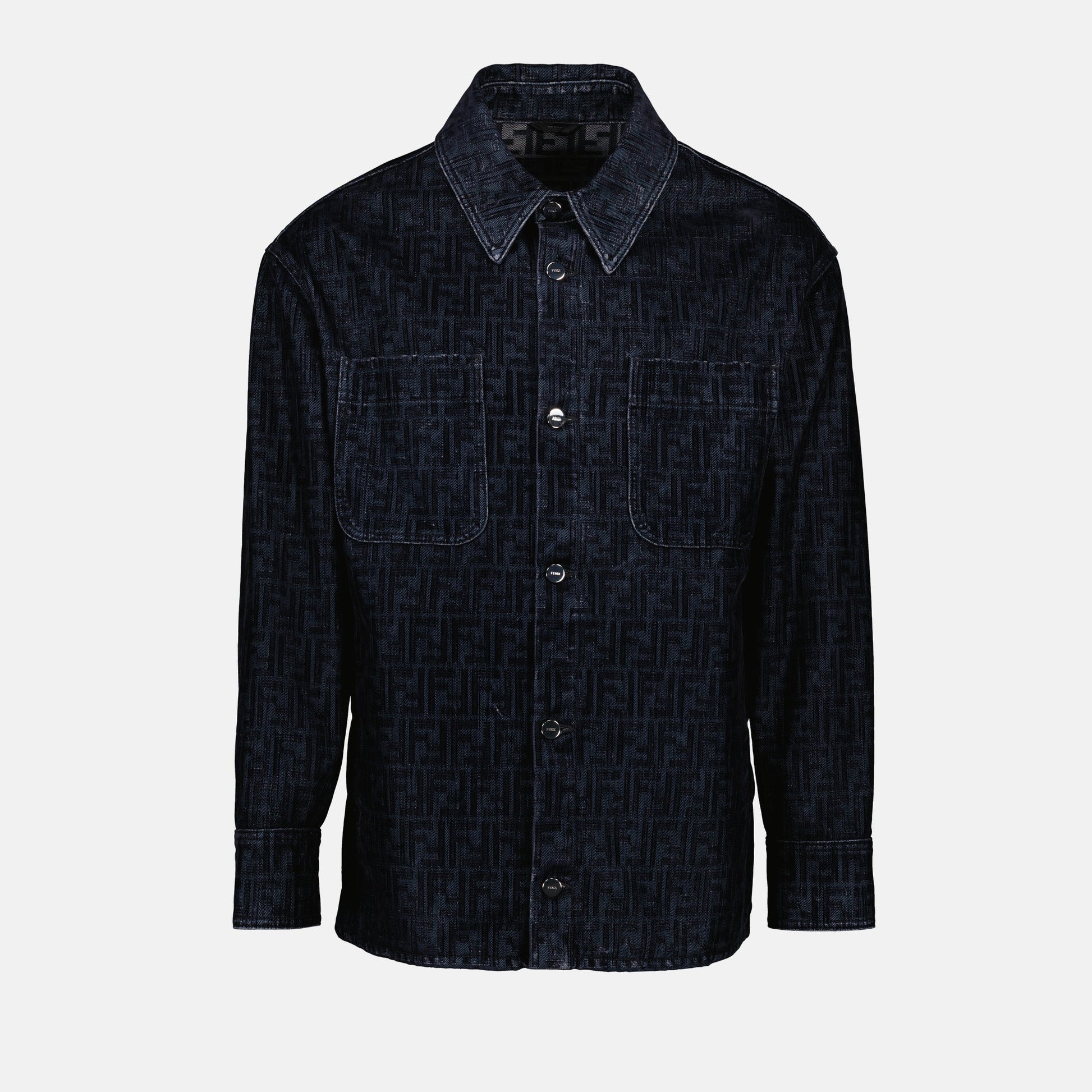 FF denim shirt from the Fendi Autumn-Winter 2024 collection for men. Made from denim. Item color medium blue. Classic collar and long sleeves.