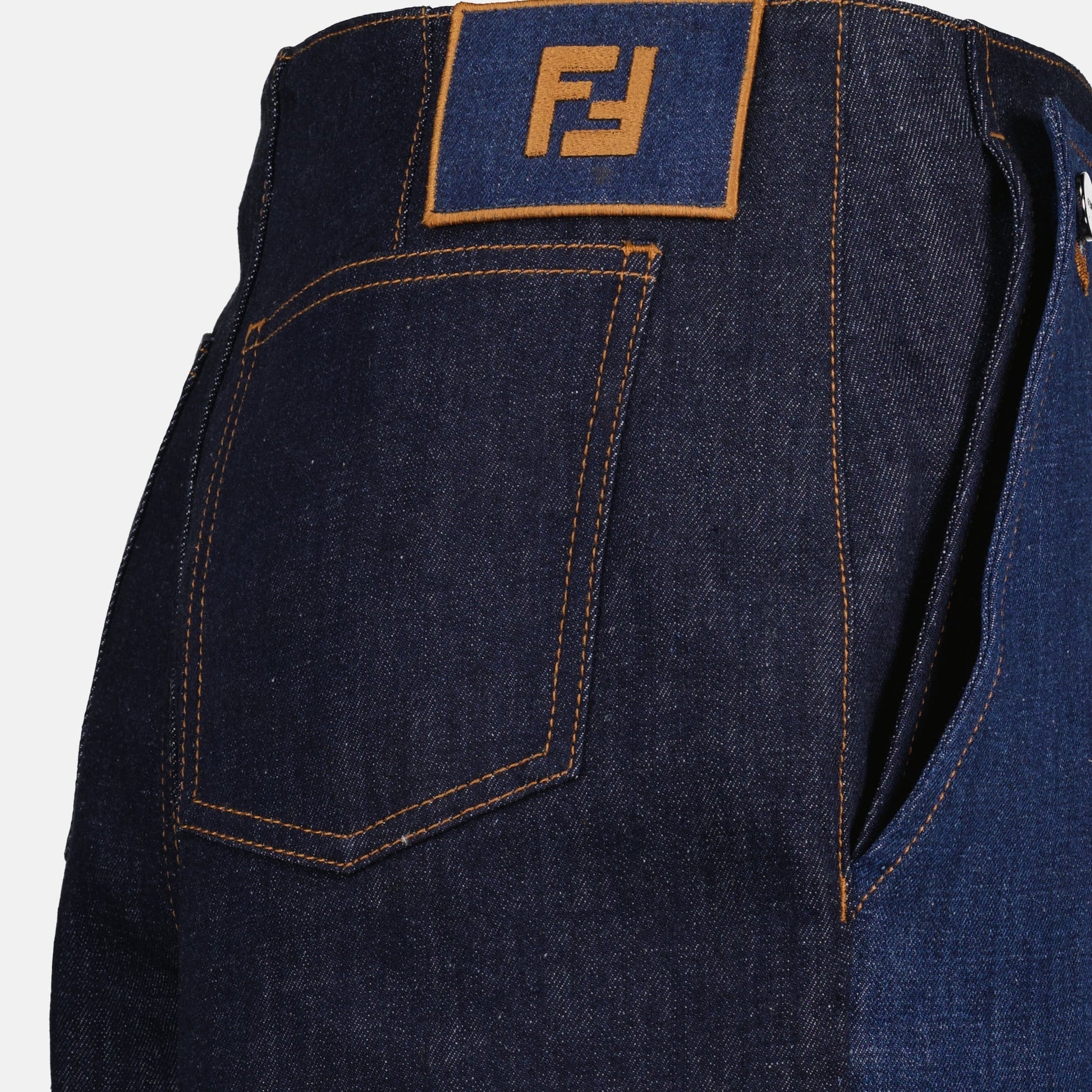 Bicolor denim shorts by Fendi for women from the Autumn-Winter 2024 collection. It features a color block design with a light blue denim front panel and an embroidered logo.