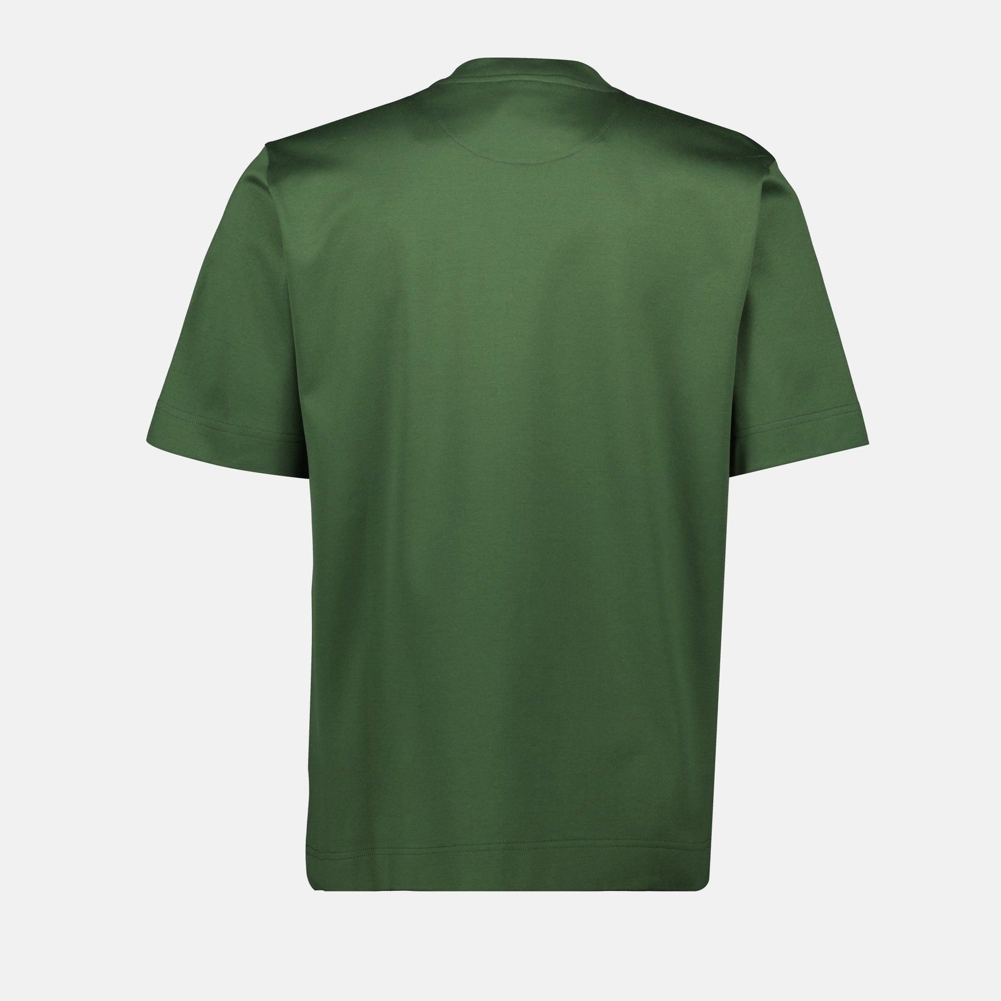 Kaki cotton T-shirt by Fendi for men from the Spring-Summer 2025 collection. It features a round neck, short sleeves, and a zip pocket on the front.