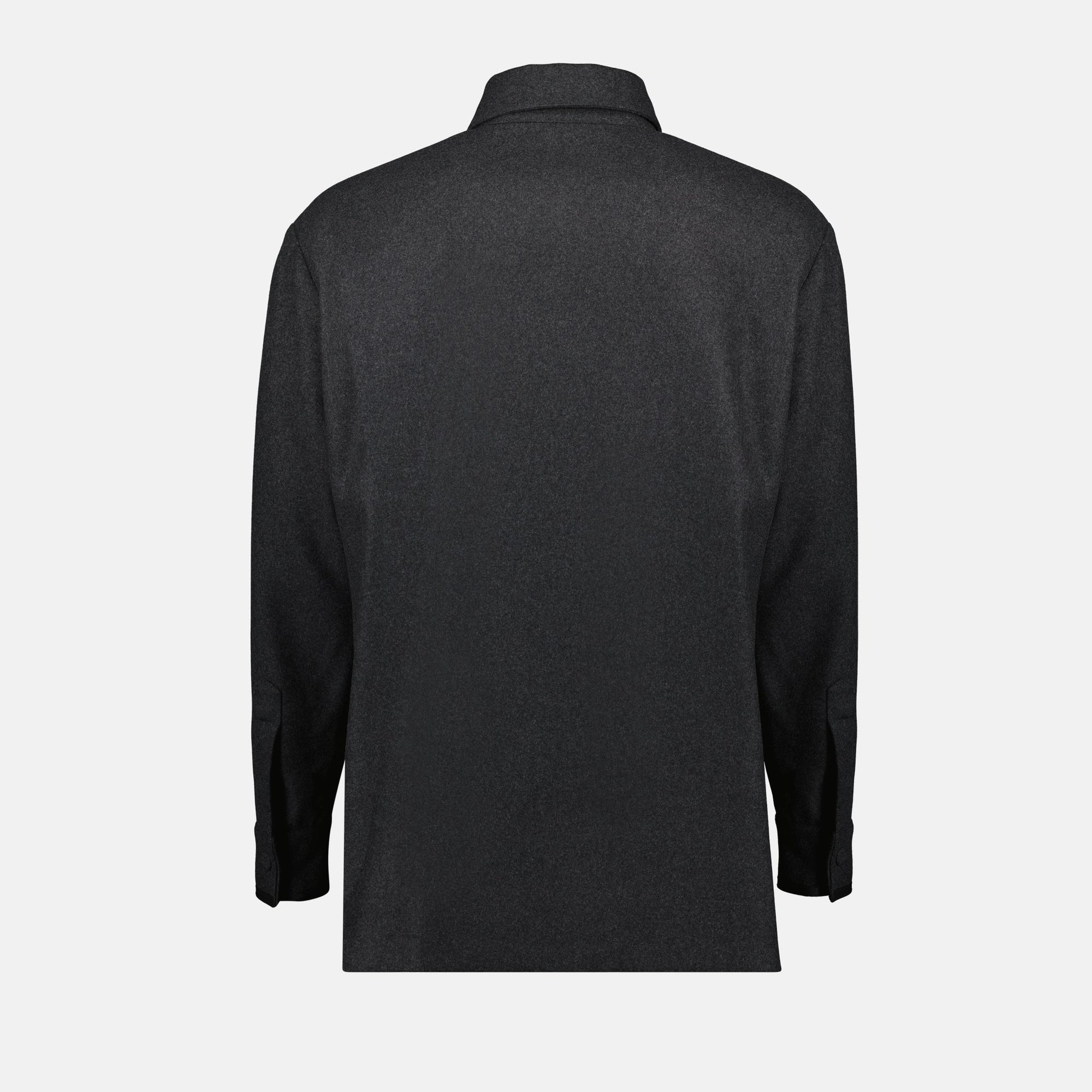 Gray wool shirt jacket by Fendi for men, from the Autumn-Winter 2024 collection. It features a classic collar, long sleeves, and elegant leather finishes.