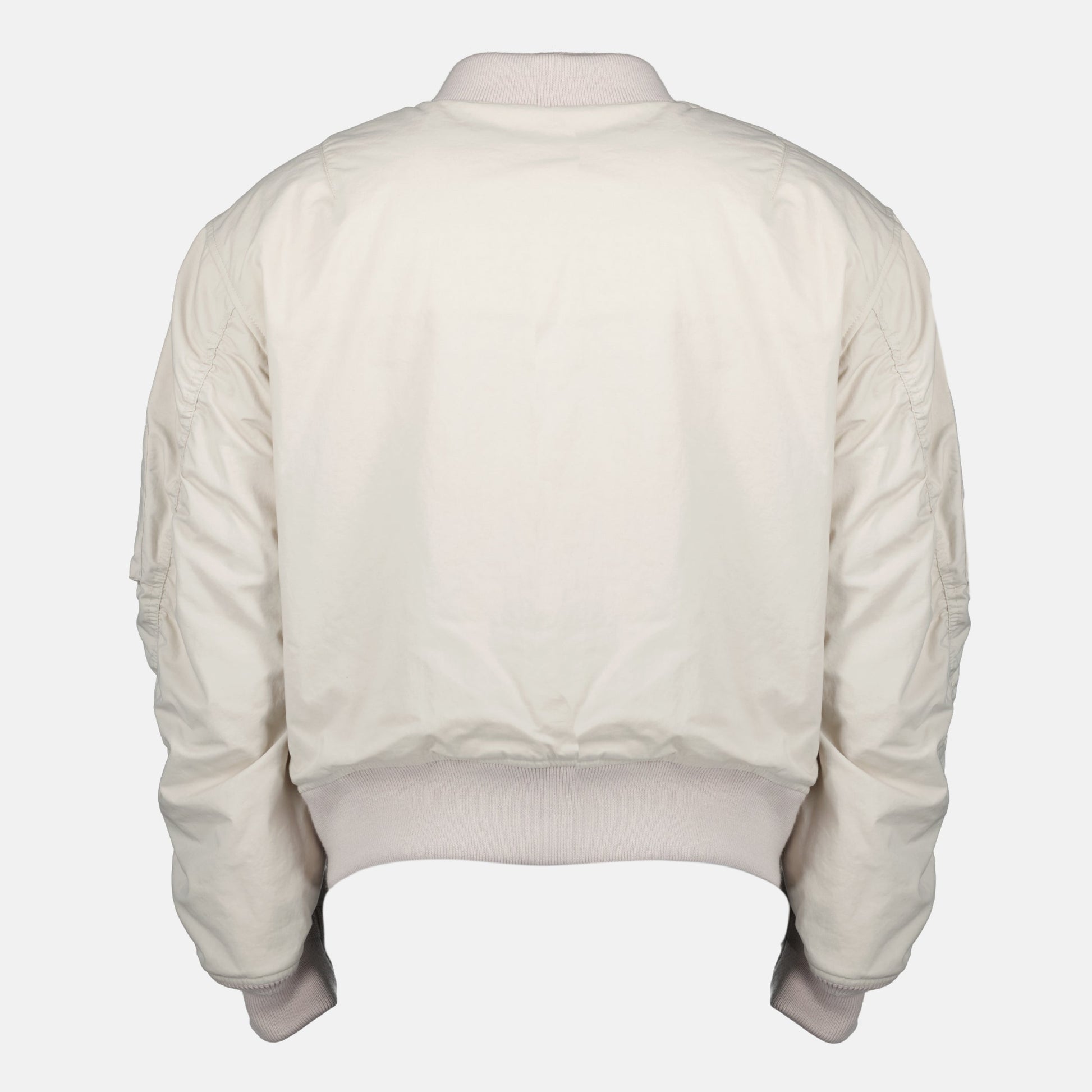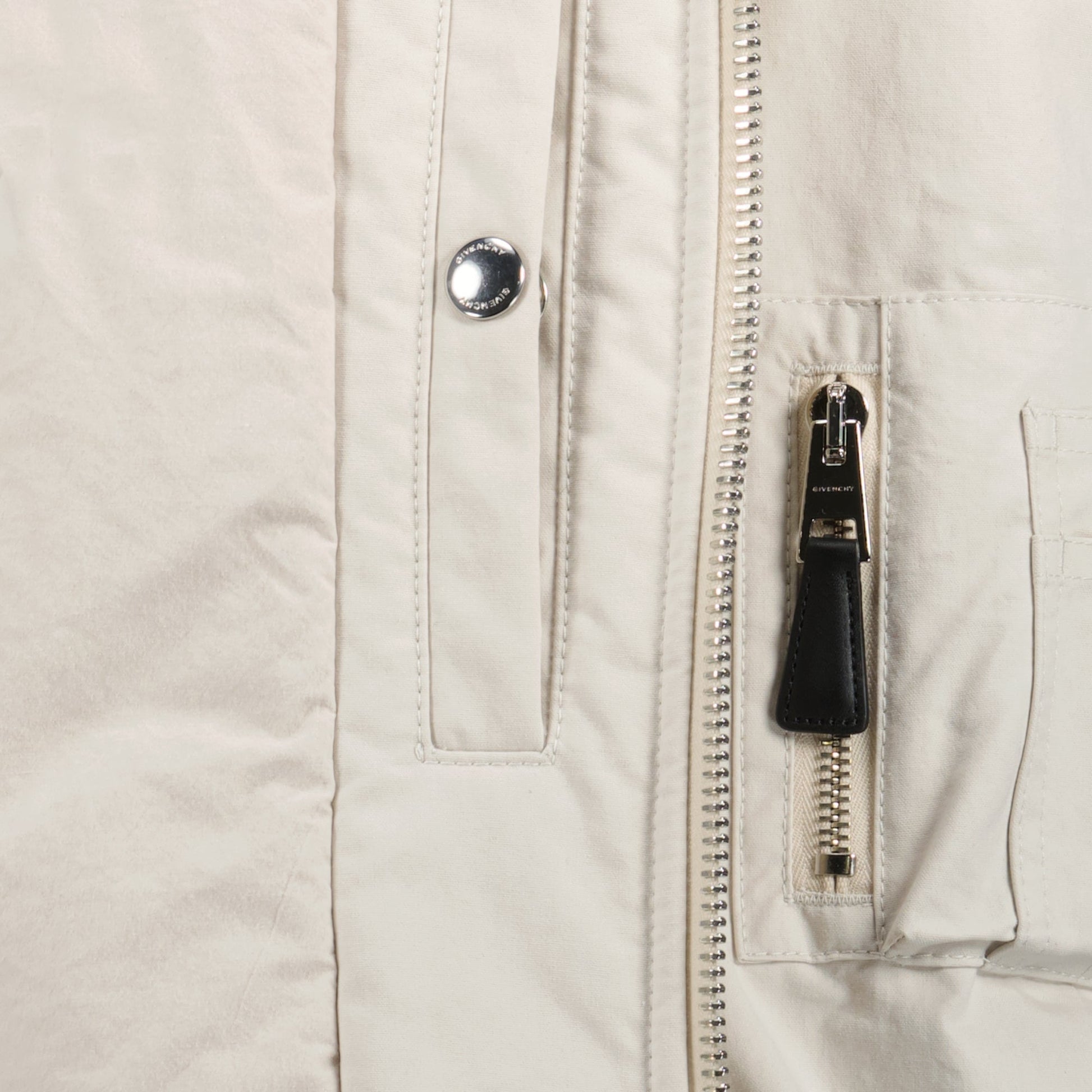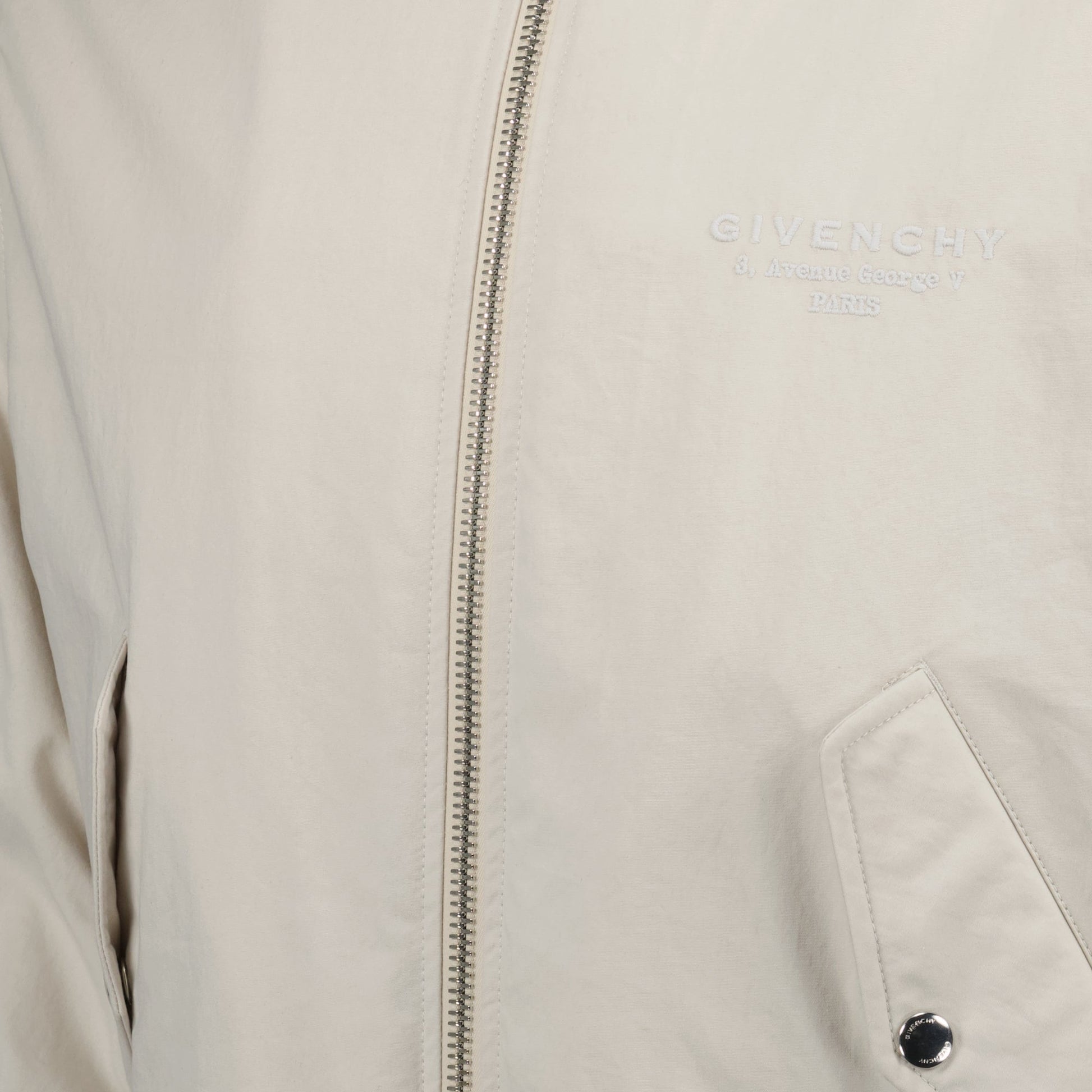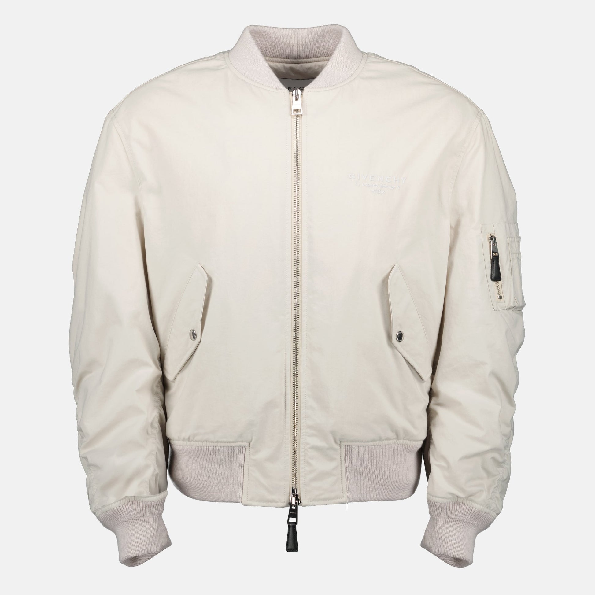 Beige cotton bomber from Givenchy for men, Autumn-Winter 2025 collection. It features a ribbed collar, long sleeves, and practical details such as zip pockets.