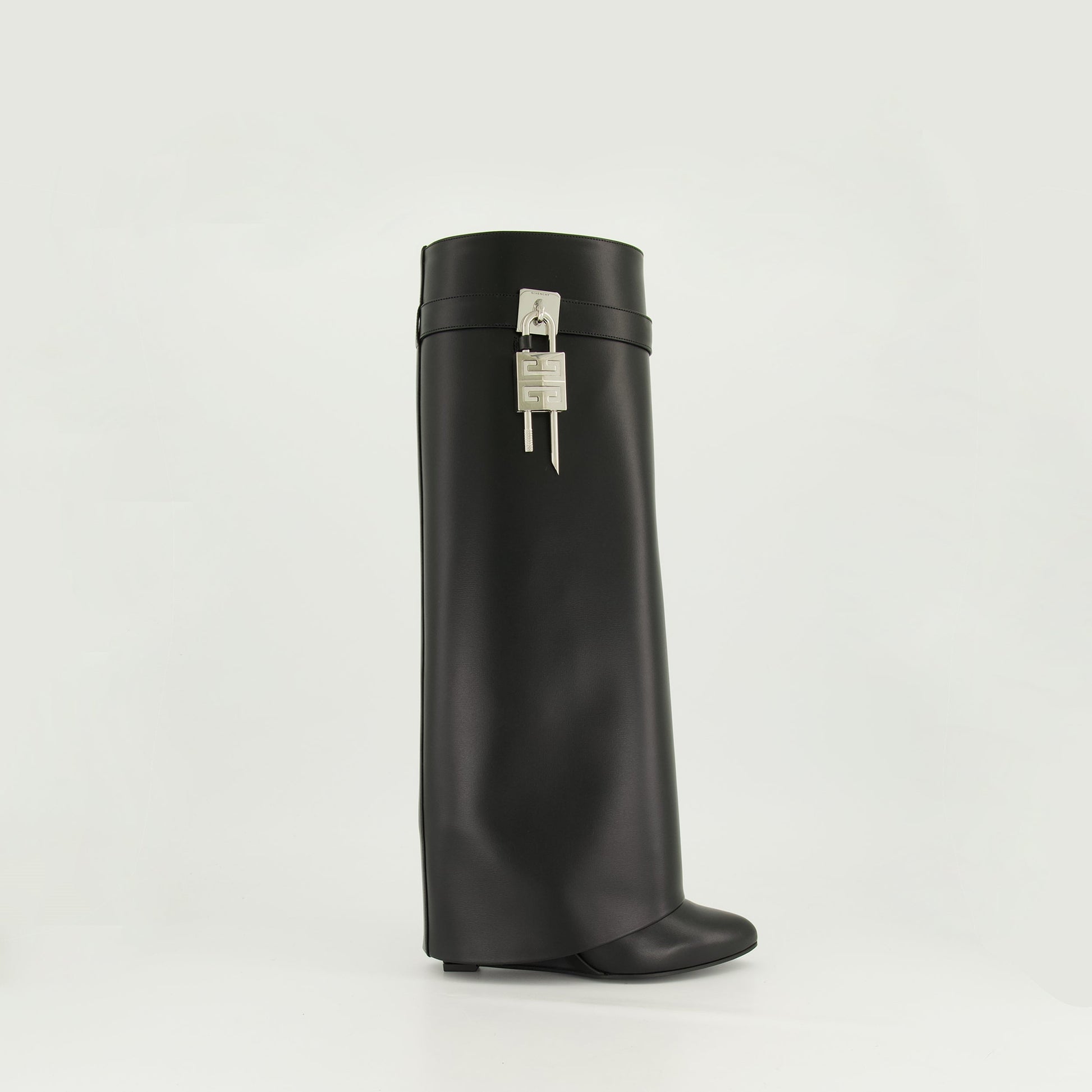 The black Shark Lock boots from Givenchy are women's shoes from the Spring-Summer 2025 collection. They are made of calf leather with a slip-on design and wedge heels.