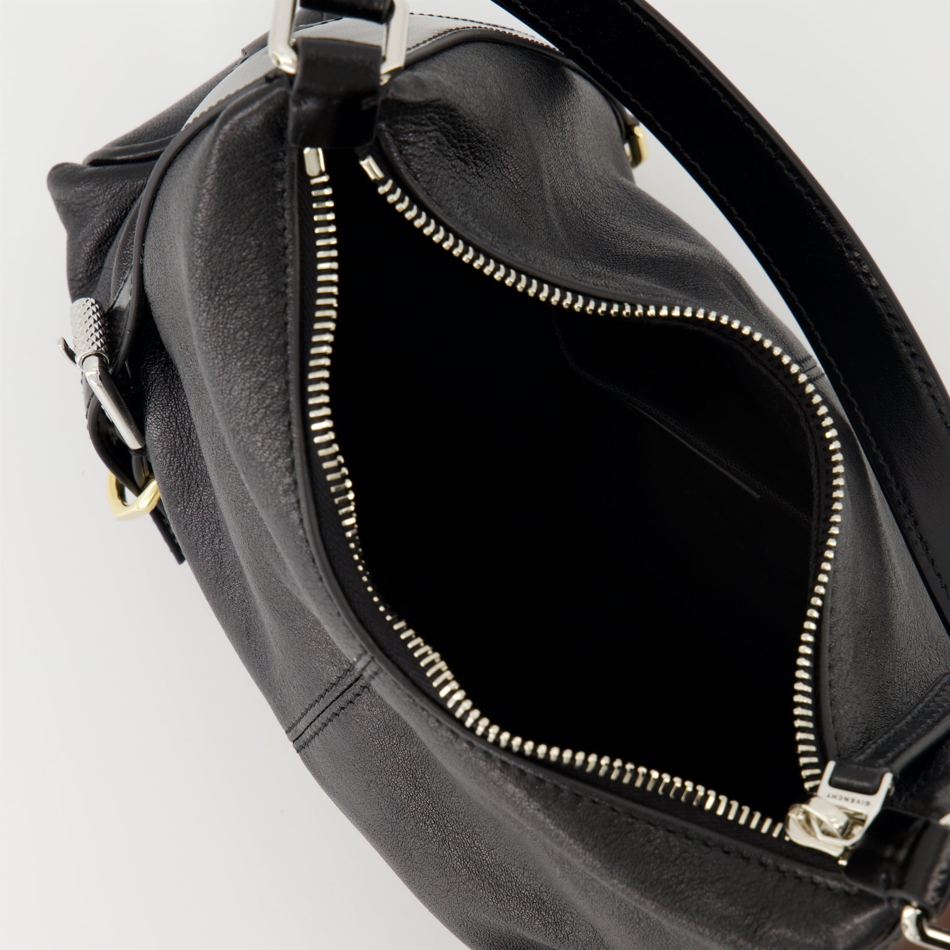 The Voyou Nano Bag in black leather by Givenchy is an elegant women's accessory. Part of the Spring-Summer 2025 collection, it stands out for its refined design and metallic details.