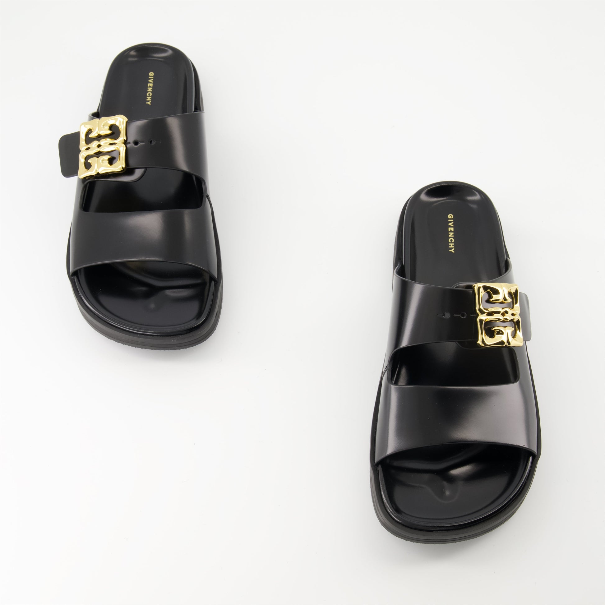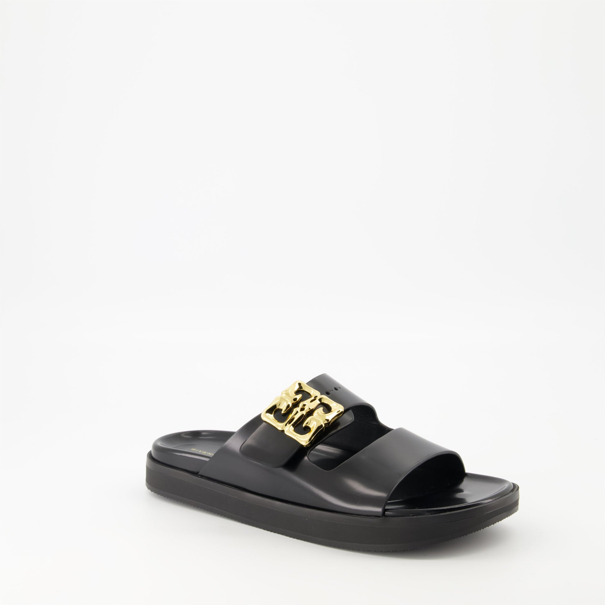 The 4G Liquid sandals in leather by Givenchy for women are elegant and refined. Part of the Spring-Summer 2025 collection, they feature smooth leather details and a metallic logo.
