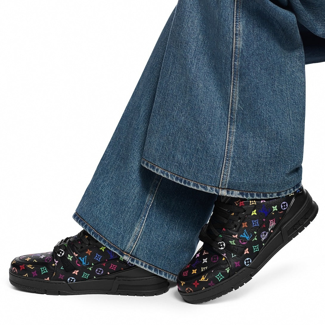 The iconic LV Trainer sneaker gets a striking update for the Louis Vuitton x Murakami Collection reissue. Crafted from grained calfskin with a printed multicolored Monogram motif, inspired by the artist's exuberant aesthetic. Evoking vintage-style sneakers, the style features a cursive Louis Vuitton signature on the vamp and the number 54 printed on the back, a reference to 1854, the year the Maison was founded.