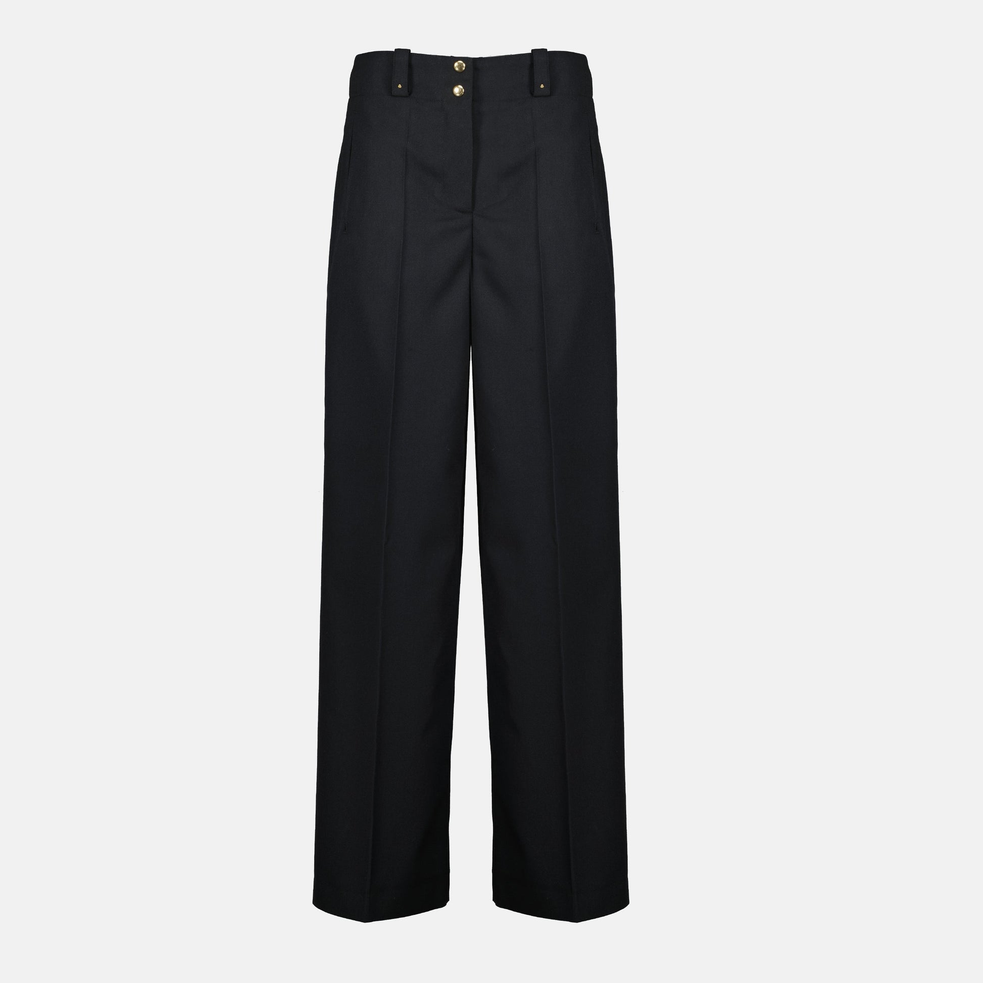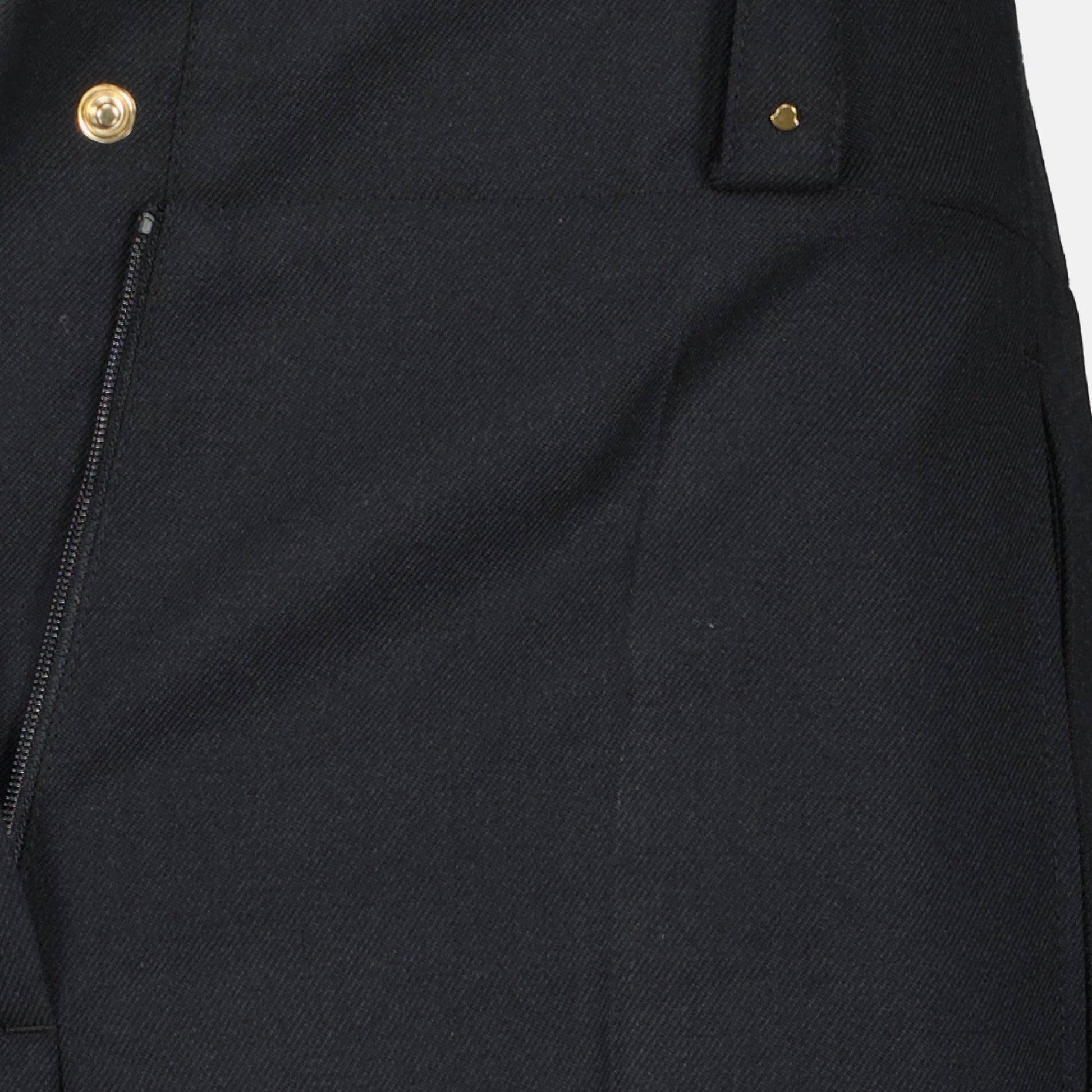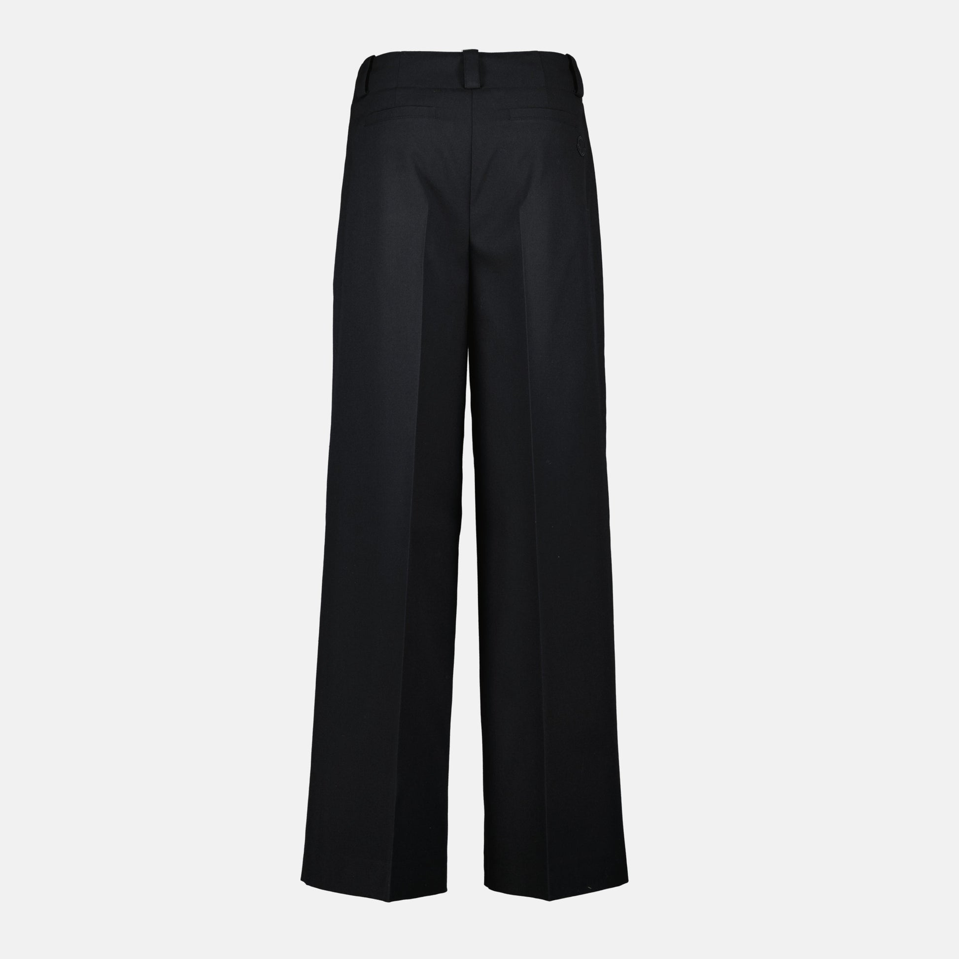 Black wool pants from Moncler for women, part of the Fall-Winter 2025 collection. It features a button and zip closure with side pockets and a logo patch.