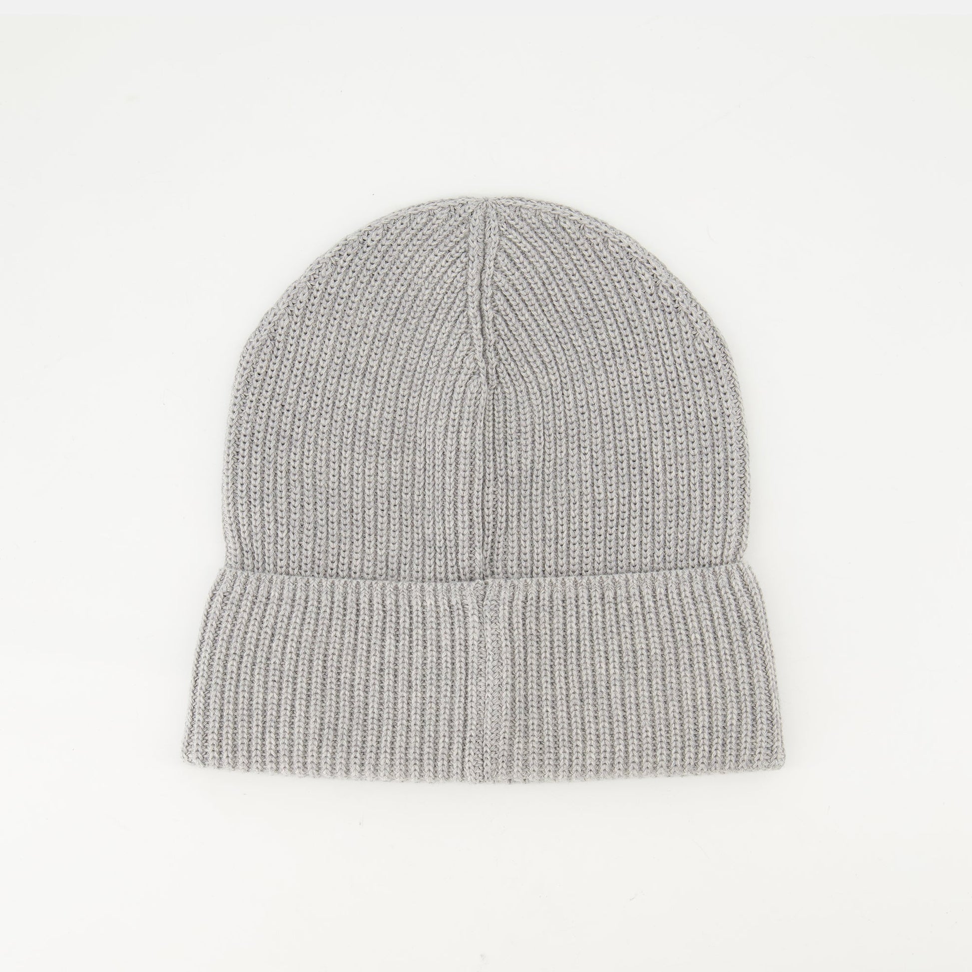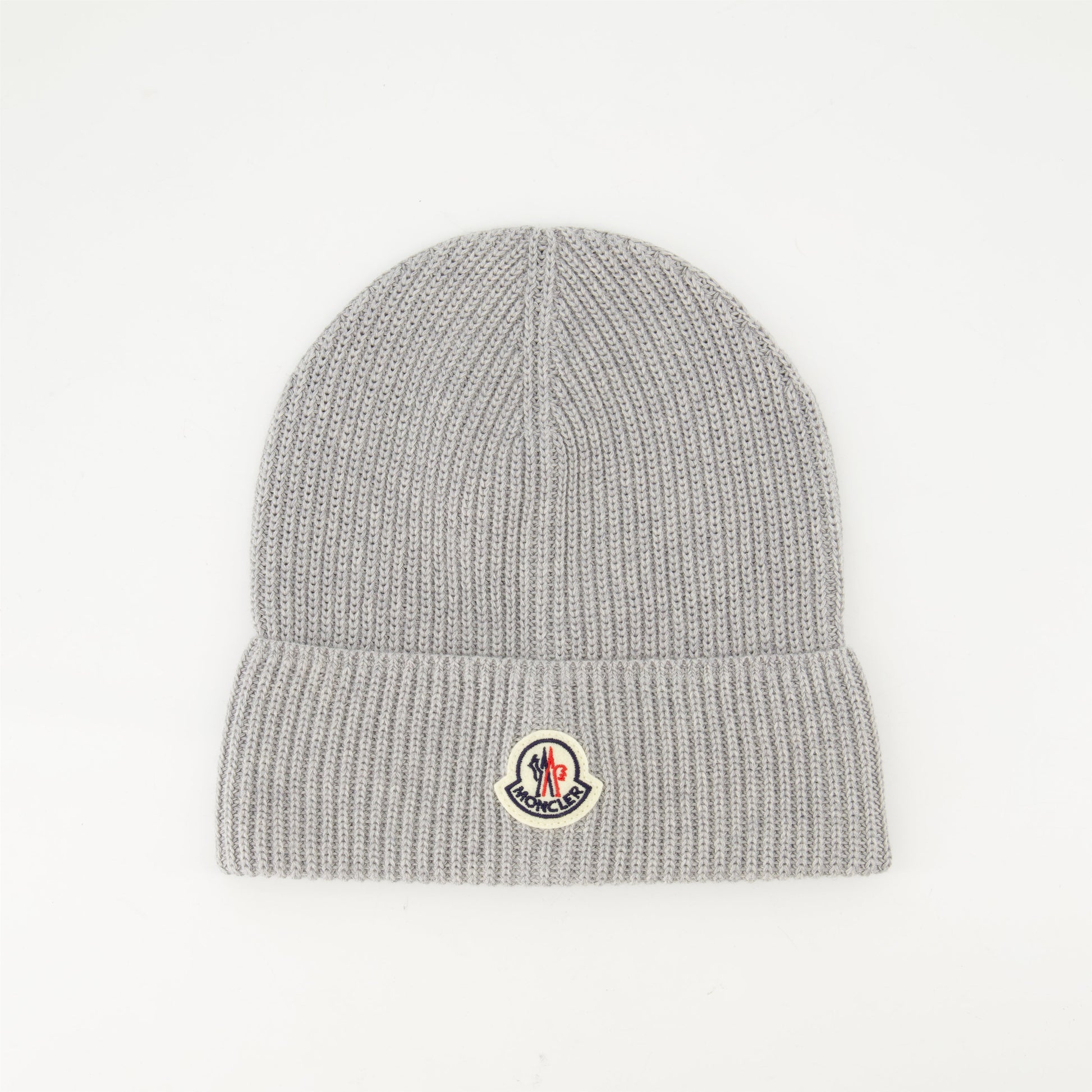 Gray knit beanie with Moncler logo for men, made of cotton with a folded design. This piece is part of the Spring-Summer 2025 collection.