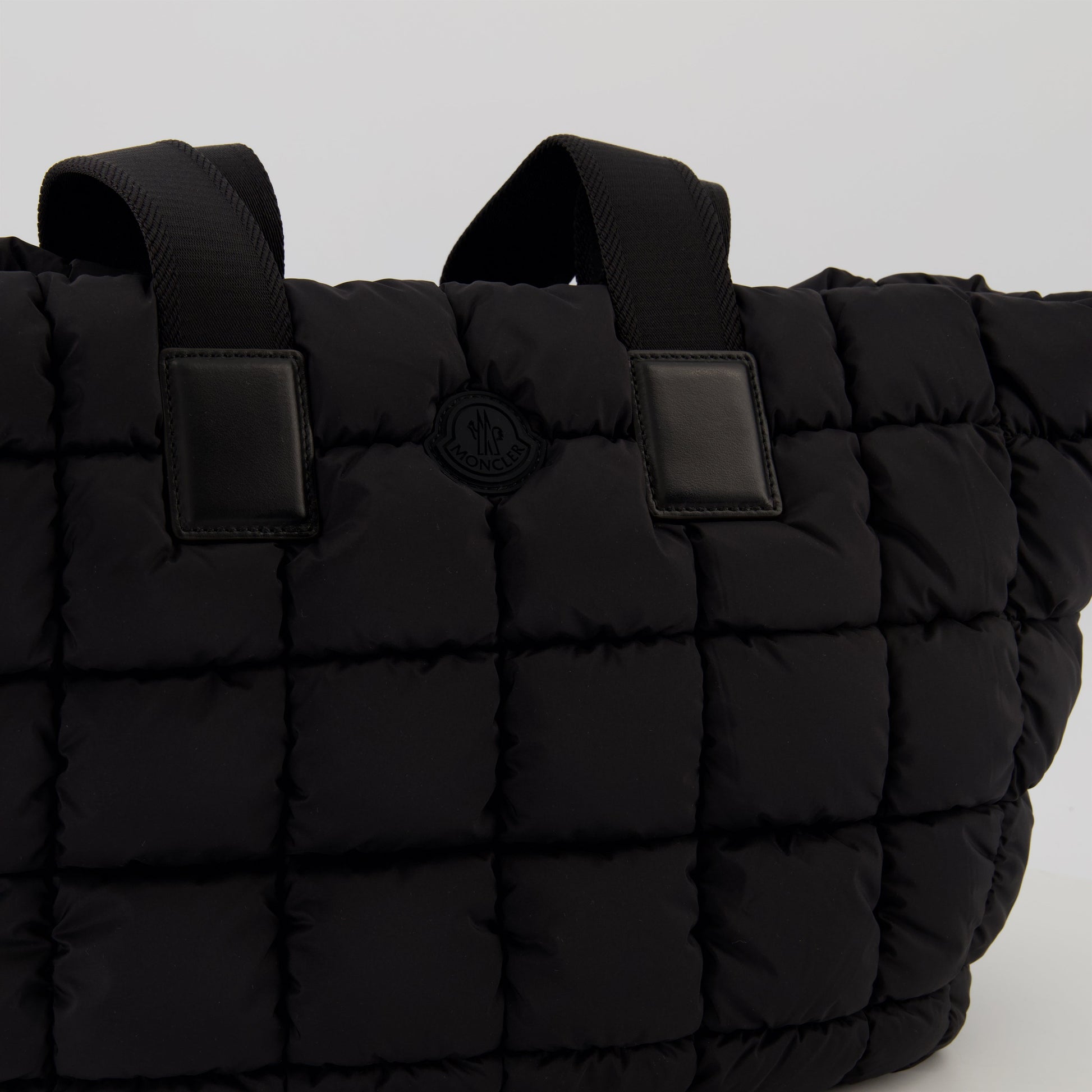The black Caradoc tote from Moncler is a women's handbag from the Spring-Summer 2025 collection. It is made from waterproof nylon with leather finishes and down padding.