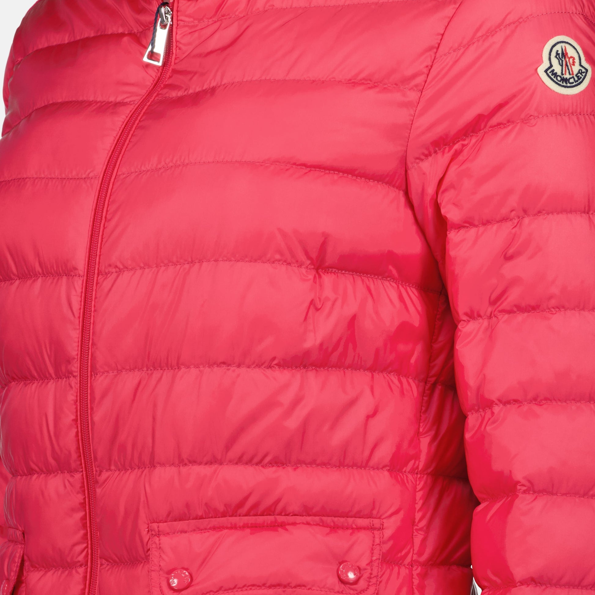 The pink Lans down jacket from Moncler is a women's garment from the Spring-Summer 2025 collection. It features a slim cut, a high collar, and down padding.
