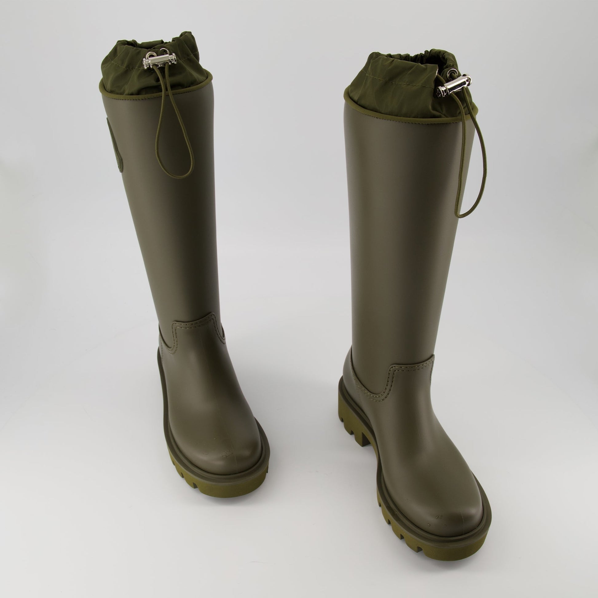 Kickstream high rain boots in khaki by Moncler for women. This pair is part of the Autumn-Winter 2025 collection and is made from PVC and nylon, providing optimal waterproofing.