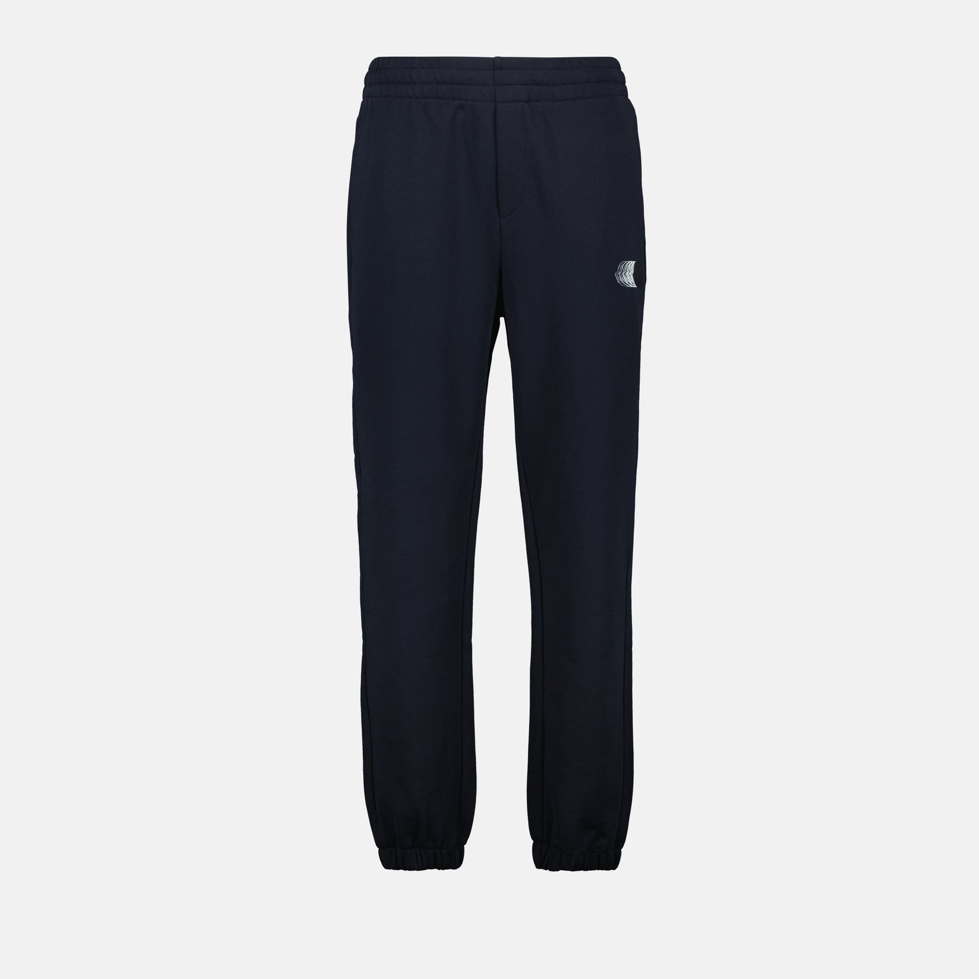 Faded navy blue logo jogger pants from the brand Moncler, designed for men. It is part of the Spring-Summer 2025 collection, combining comfort and modern style.