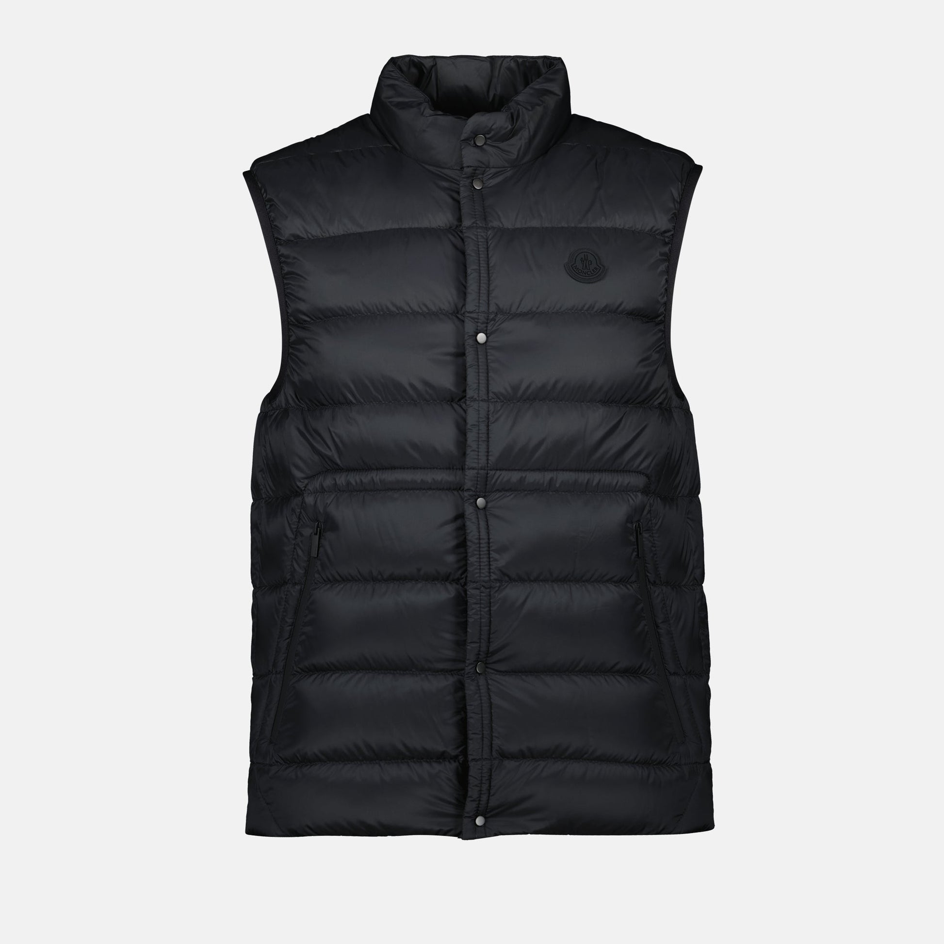 The black Plaret sleeveless puffer from Moncler is a men's garment from the Spring-Summer 2025 collection. It is made of recycled nylon with down padding.