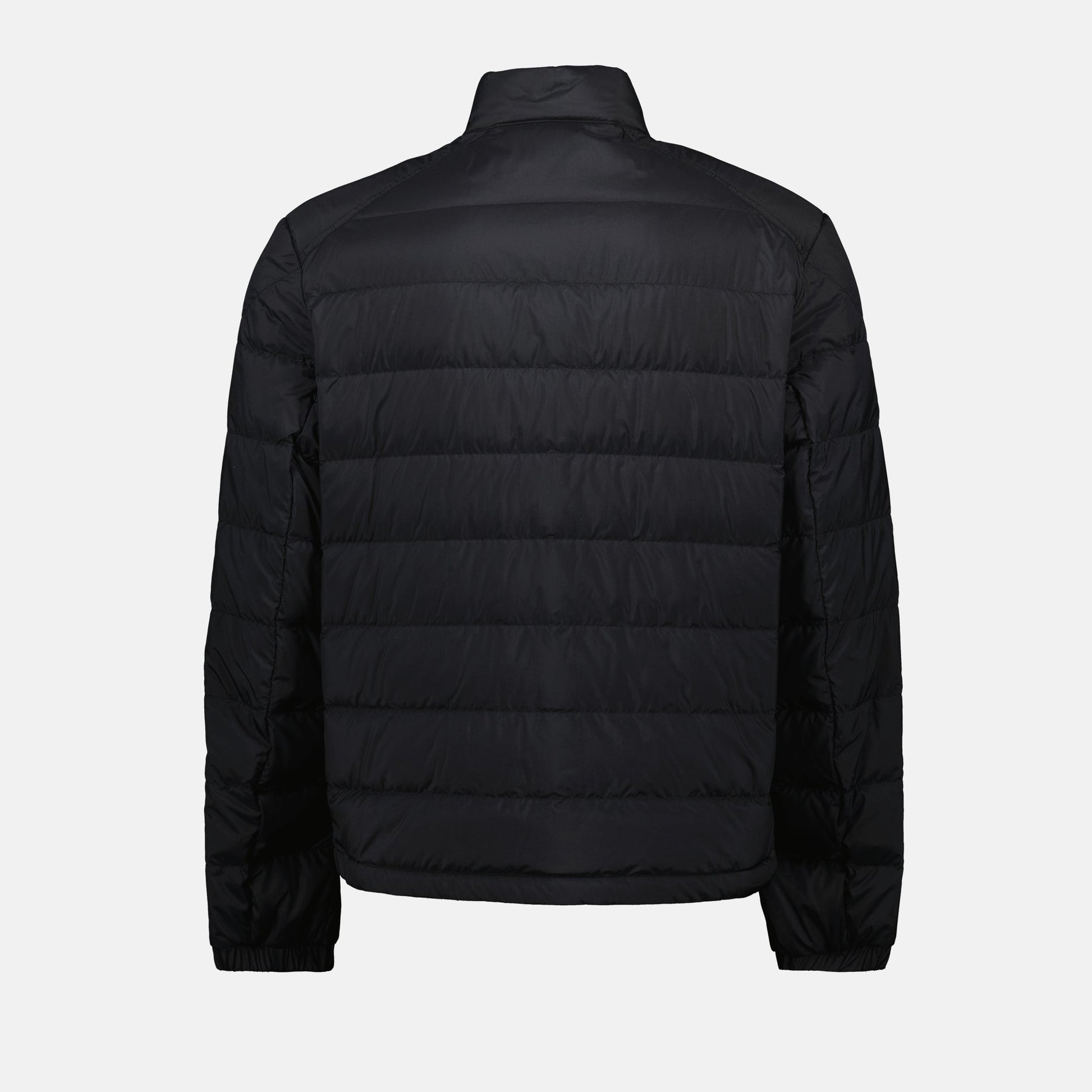 Black nylon down jacket from the brand Moncler, designed for men. This piece is part of the Spring-Summer 2025 collection and features down filling and practical details.