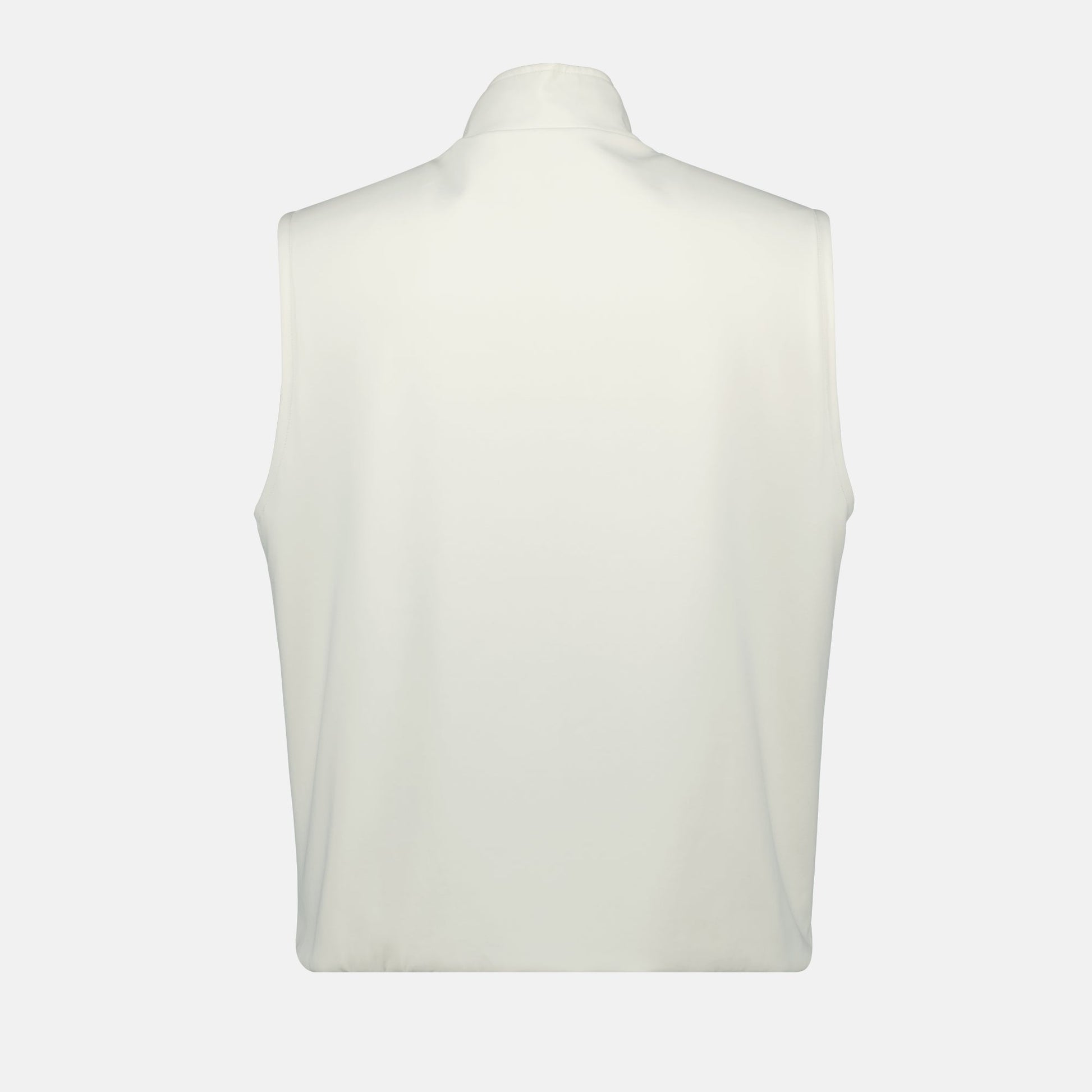 Reversible quilted sleeveless vest from Moncler for men from the Spring-Summer 2025 collection. It is made of cotton, polyamide, and elastane with zippered side pockets and a high collar.