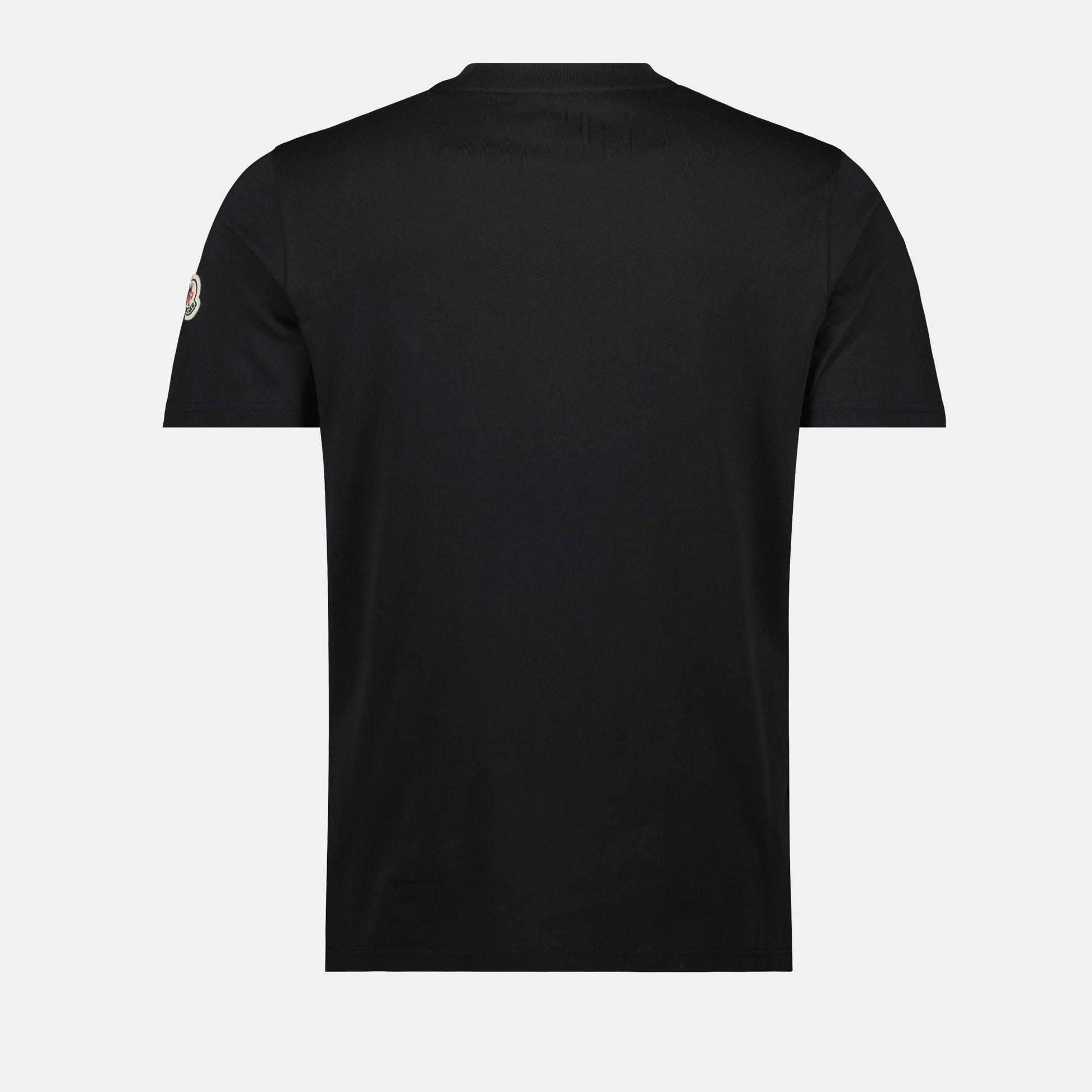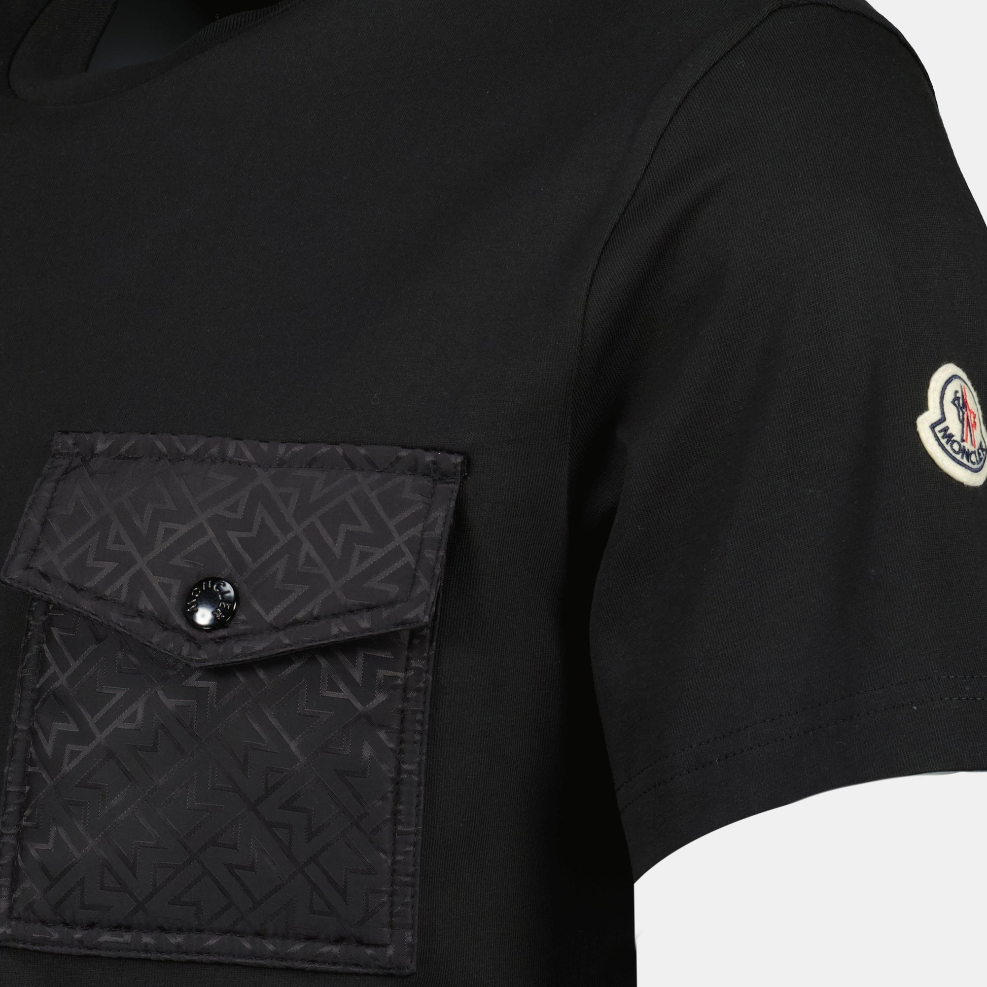 Black monogram pocket T-shirt from Moncler for men, part of the Spring-Summer 2025 collection. It is made from cotton jersey with a nylon chest pocket and a felt logo.