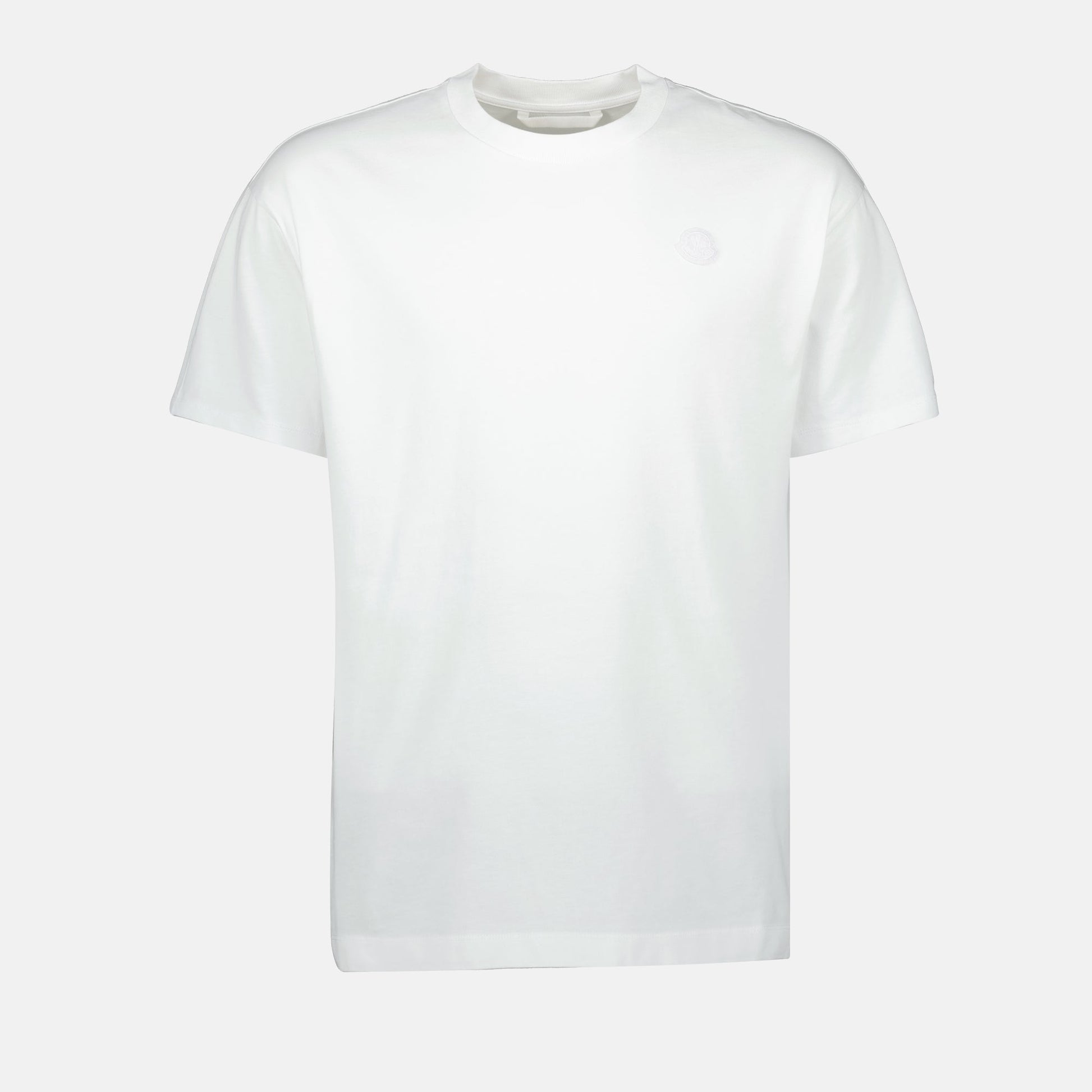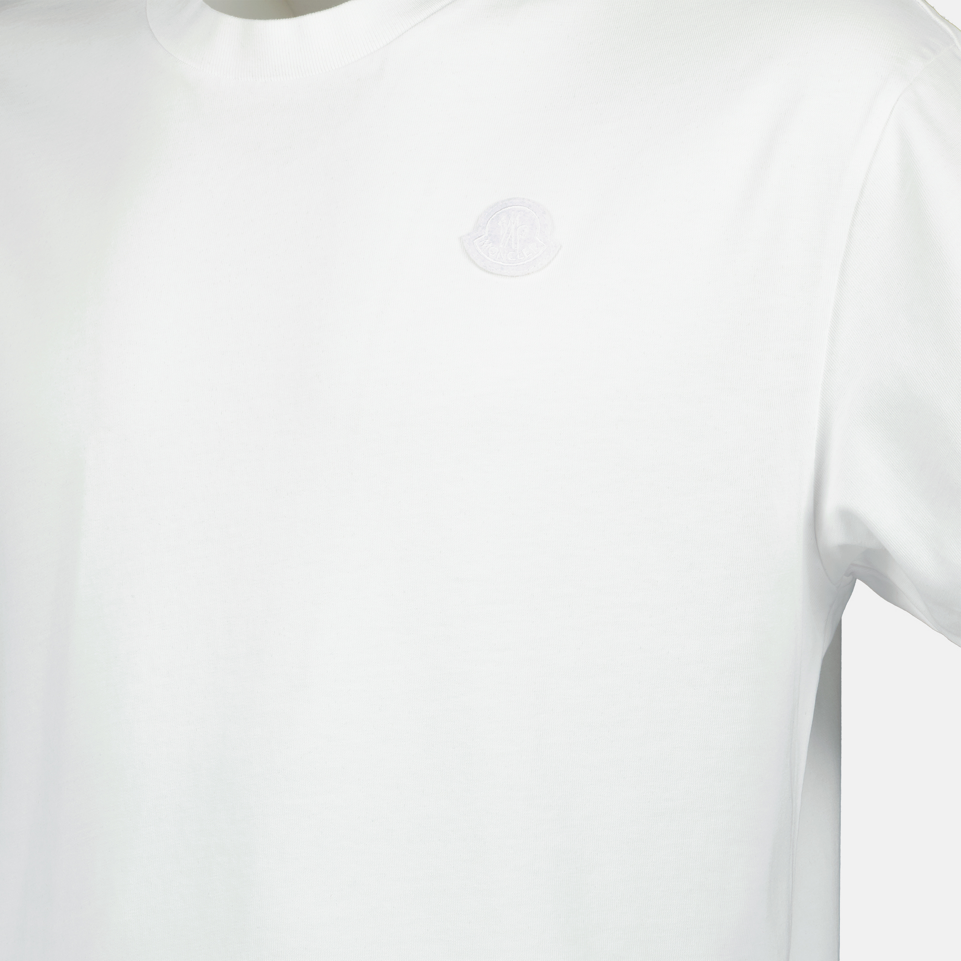 White graffiti T-shirt from Moncler for men, made of cotton with a round neck and short sleeves. This model is part of the Spring-Summer 2025 collection.