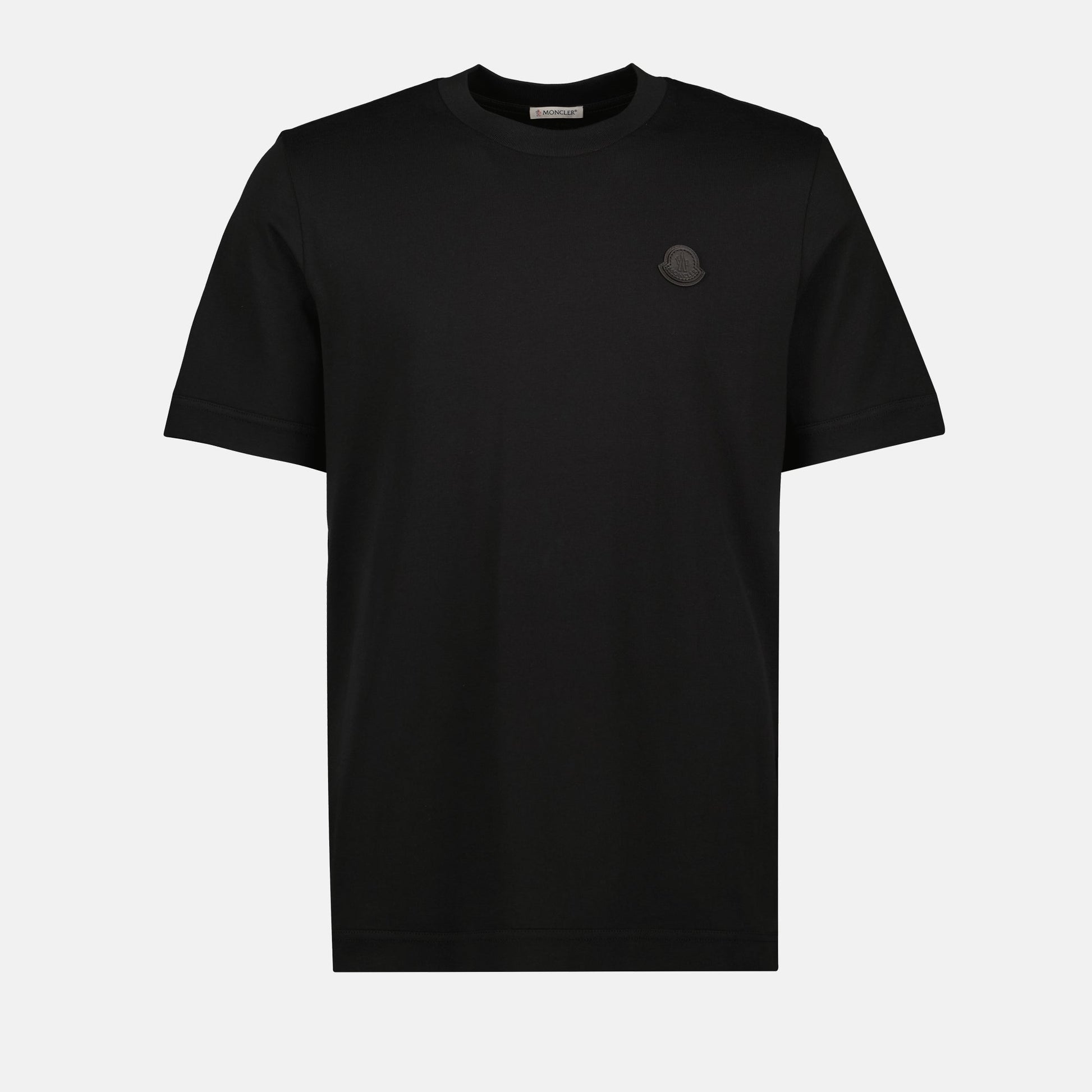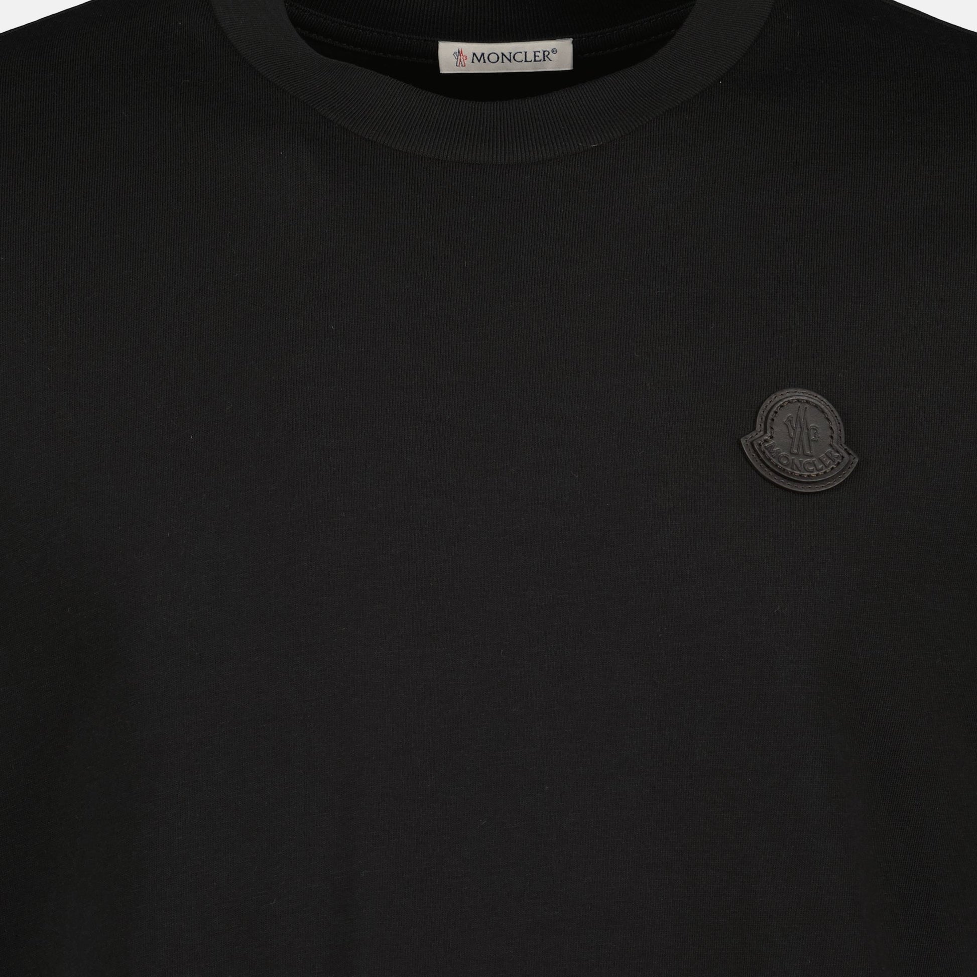 Black leather logo T-shirt from the brand Moncler for men. It is part of the Autumn-Winter 2025 collection and is made of cotton jersey with a leather patch.