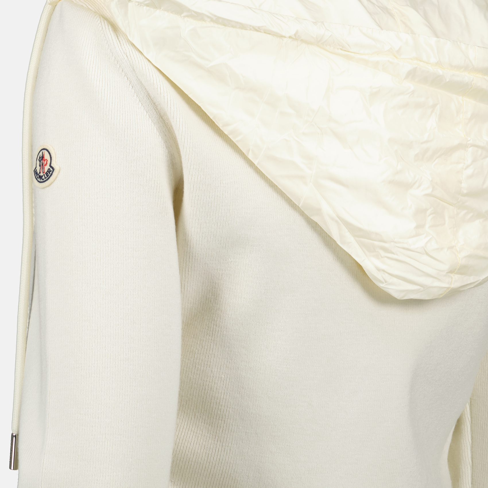 Beige two-tone jacket from Moncler for women, part of the Spring-Summer 2025 collection. It features a high collar, long sleeves, and a zip closure at the front.