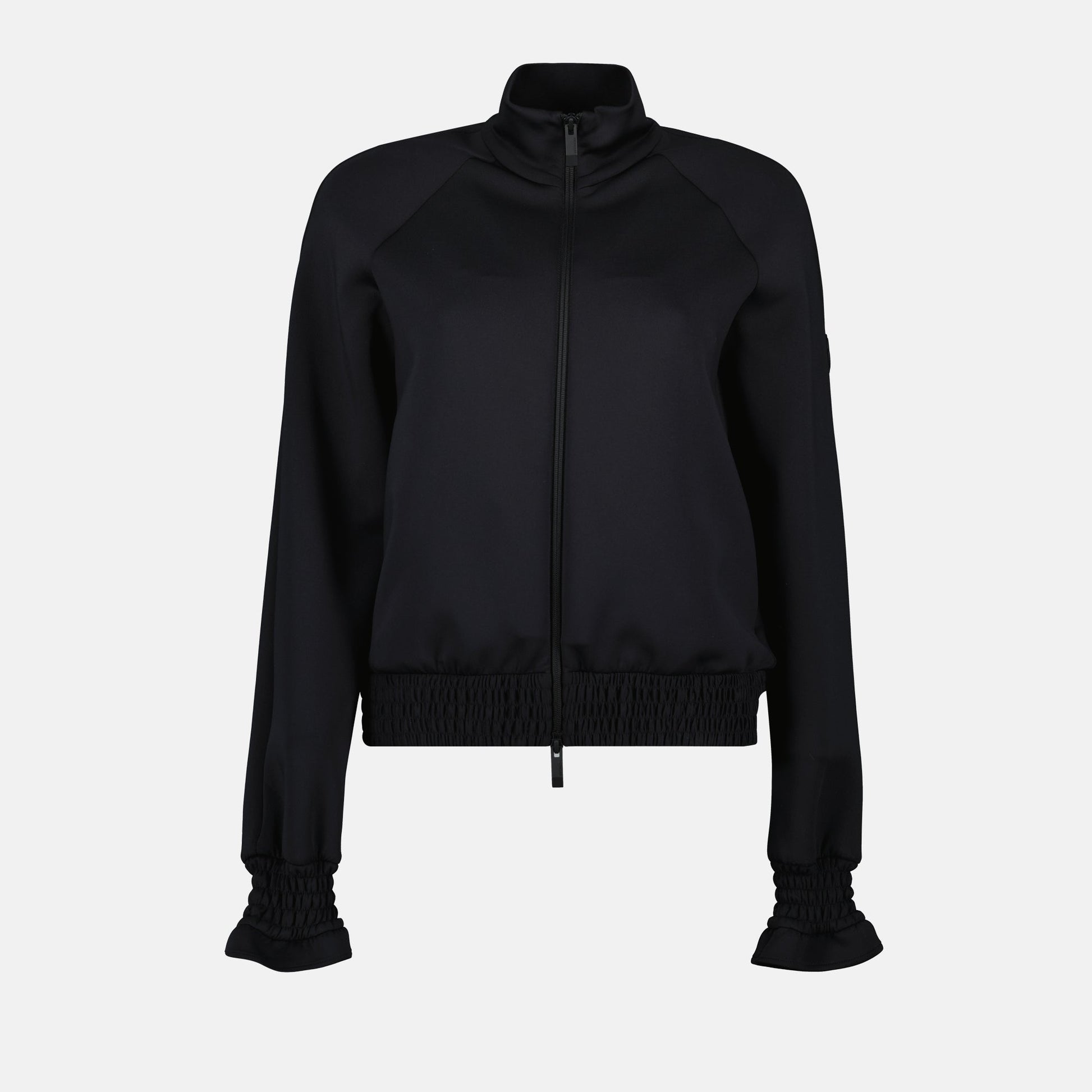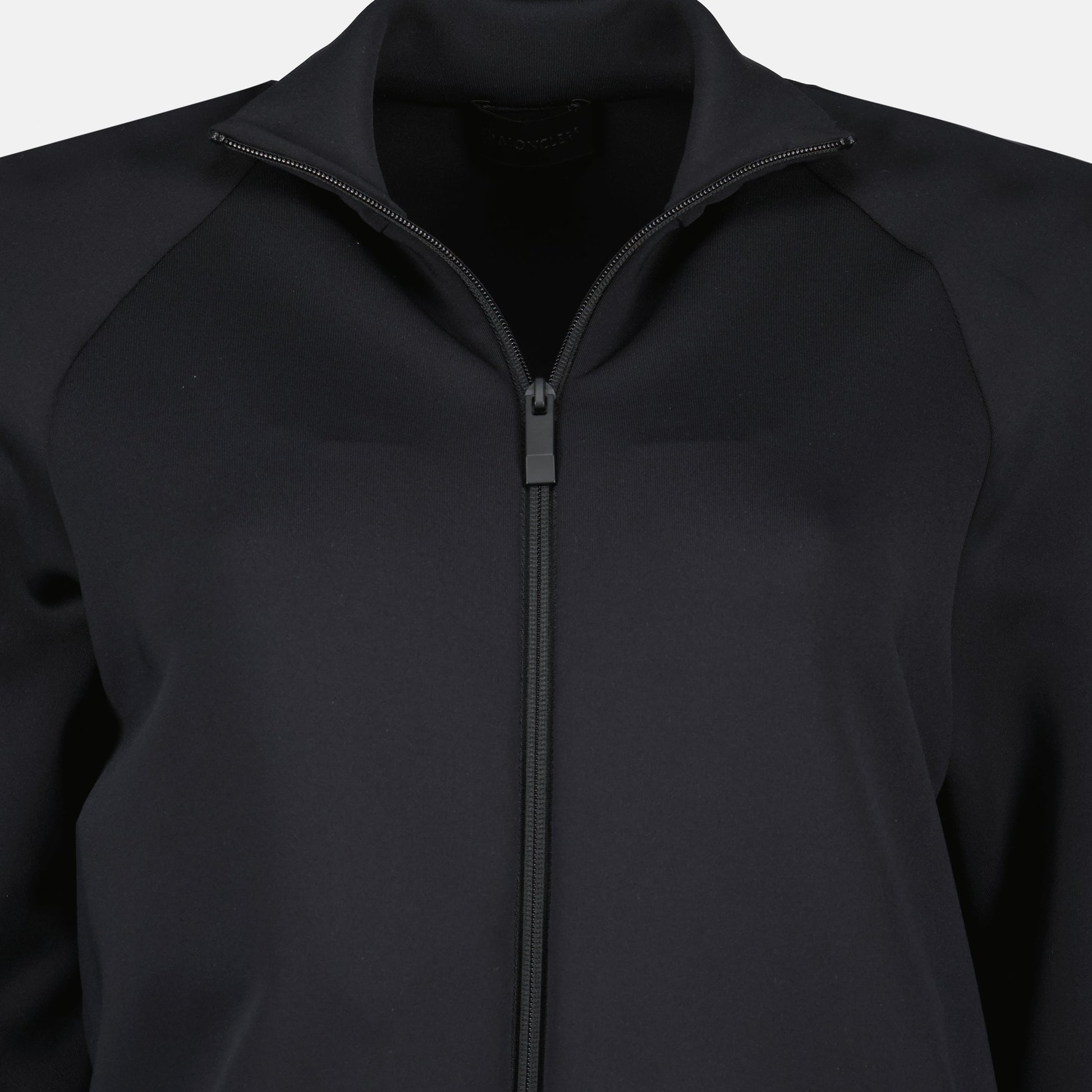 Black zipped jacket from the brand Moncler for women, made of neoprene with a high collar and long sleeves. This piece is part of the Spring-Summer 2025 collection.