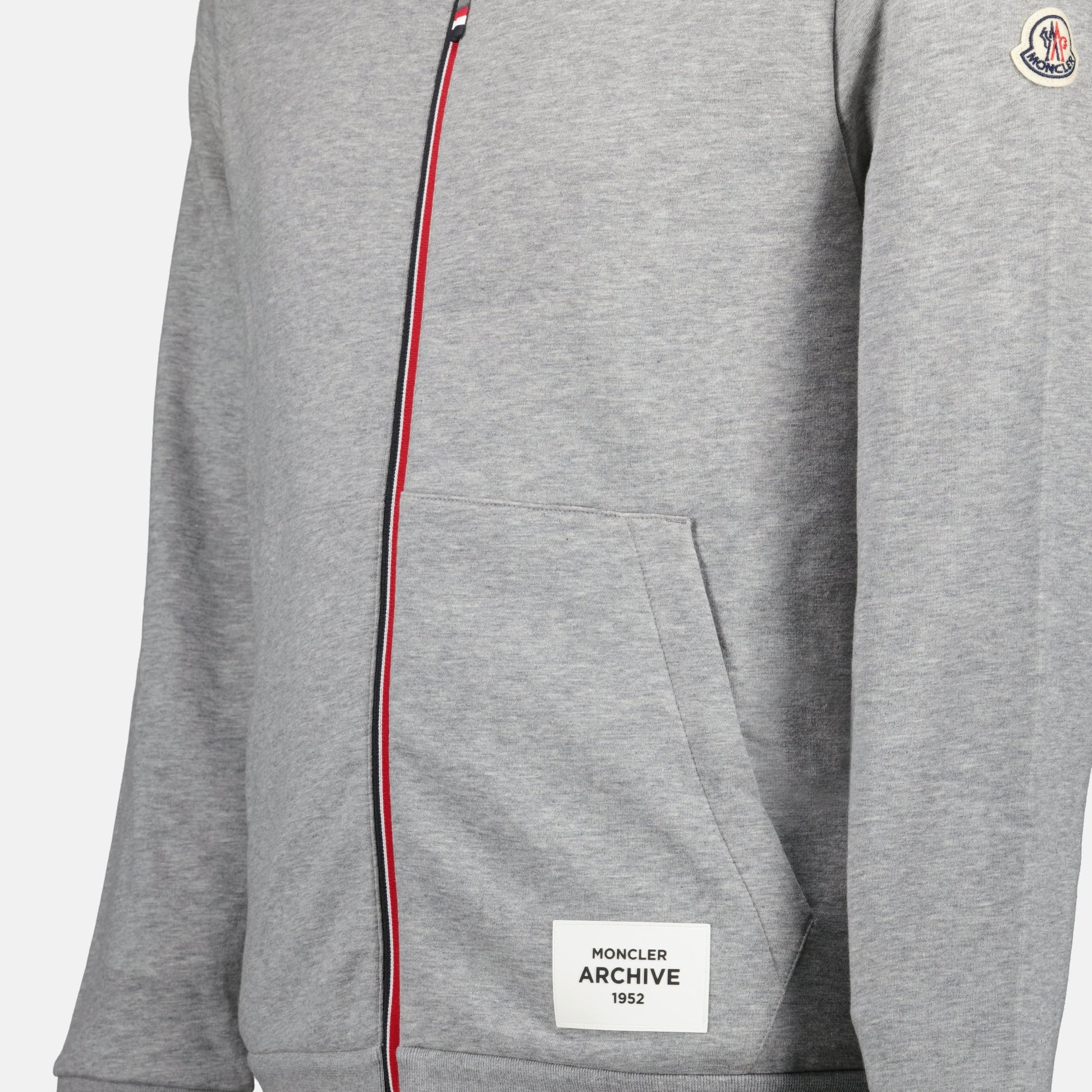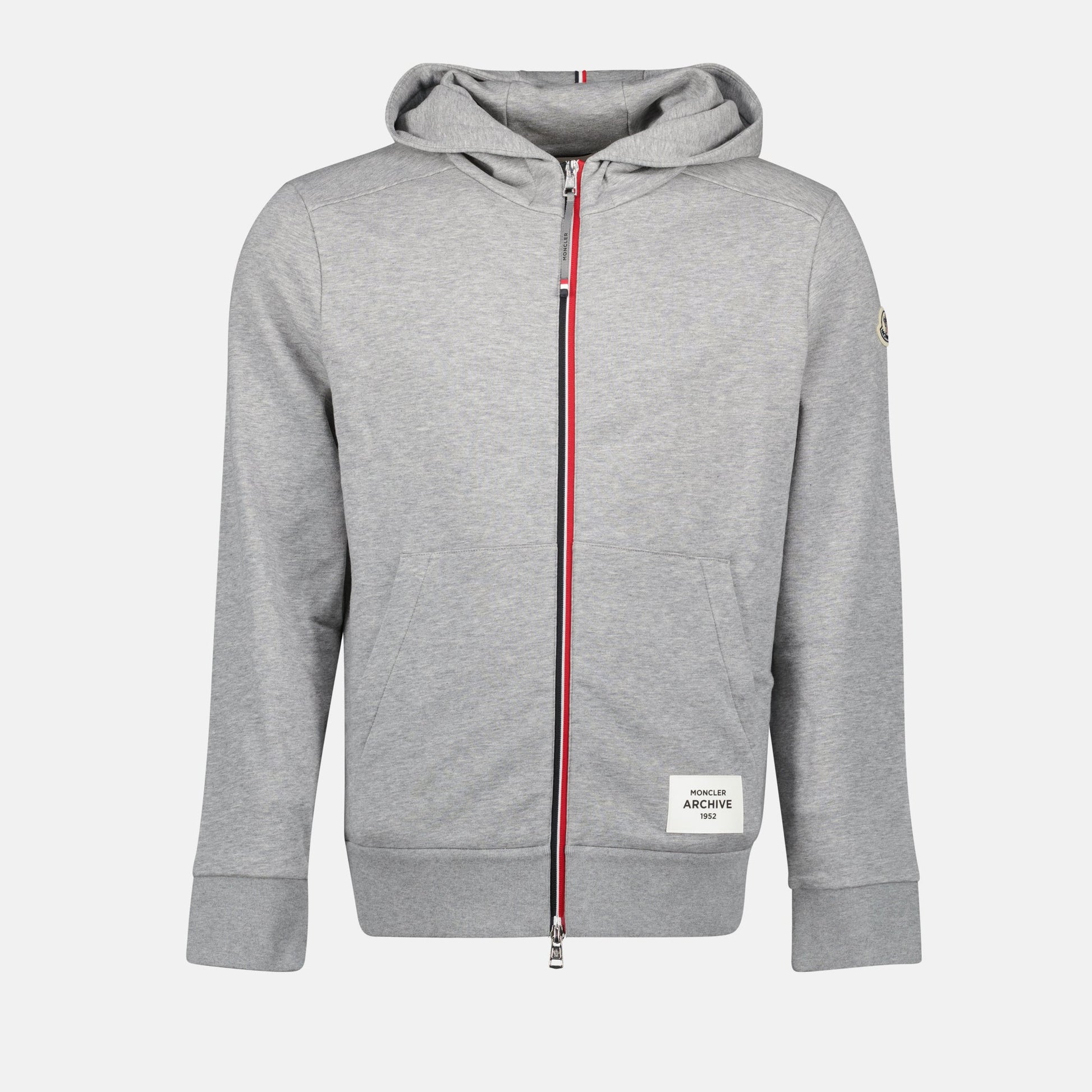 Gray zip-up hoodie from the brand Moncler, designed for men, combines comfort and style. It is part of the Autumn-Winter 2024 collection with trendy and modern details.