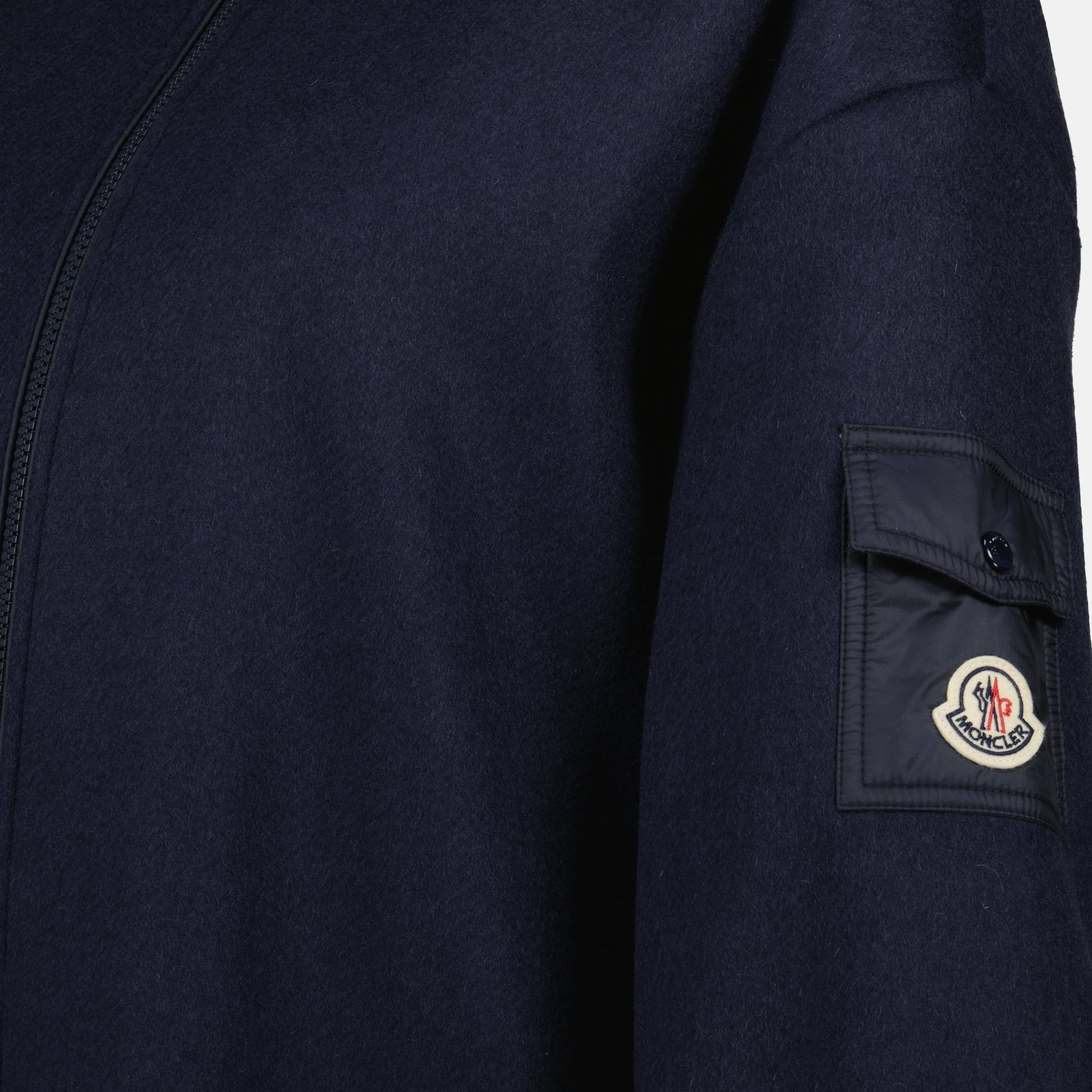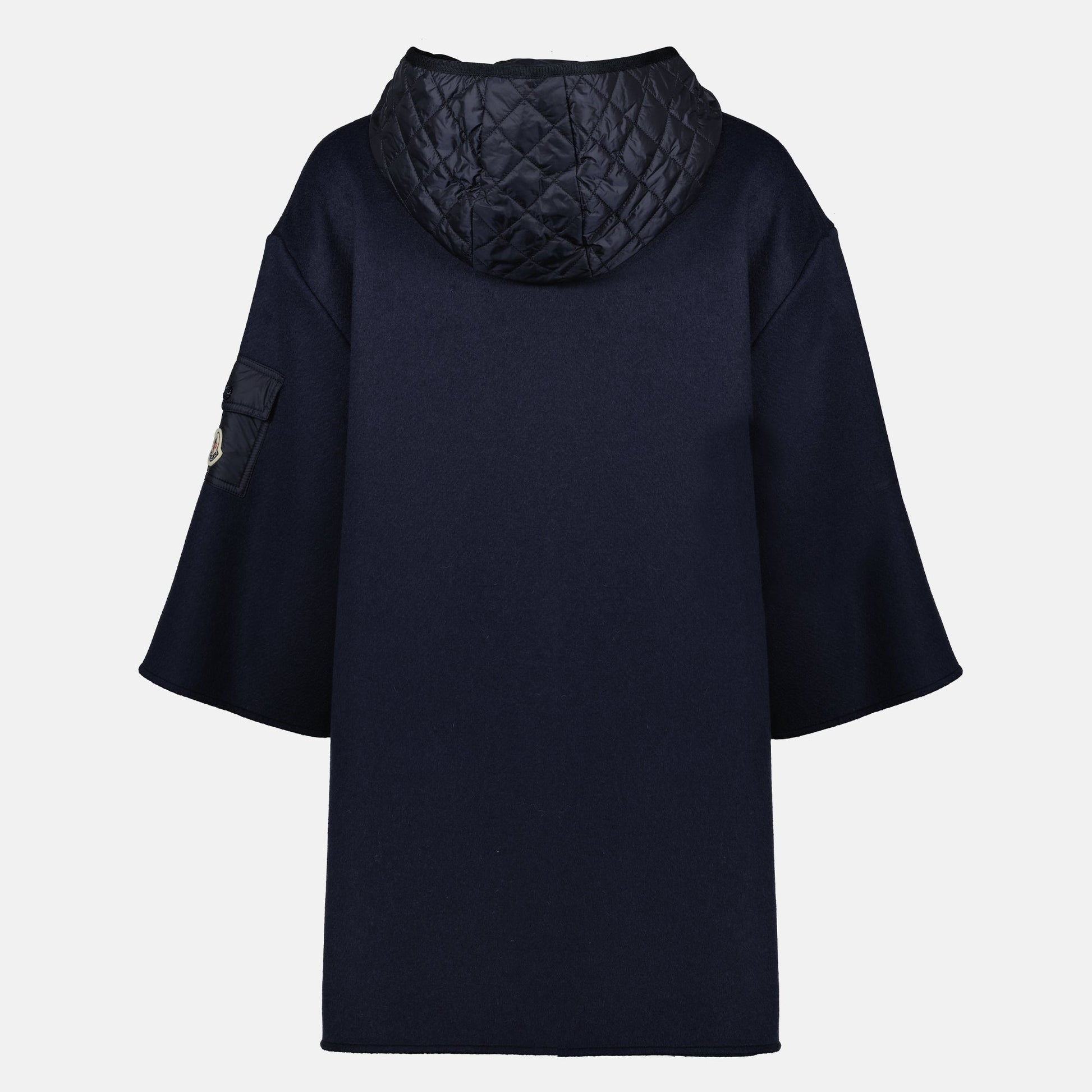 Navy blue wool zip cape from Moncler for women. This piece is part of the Autumn-Winter 2025 collection and features a high collar and a padded hood.