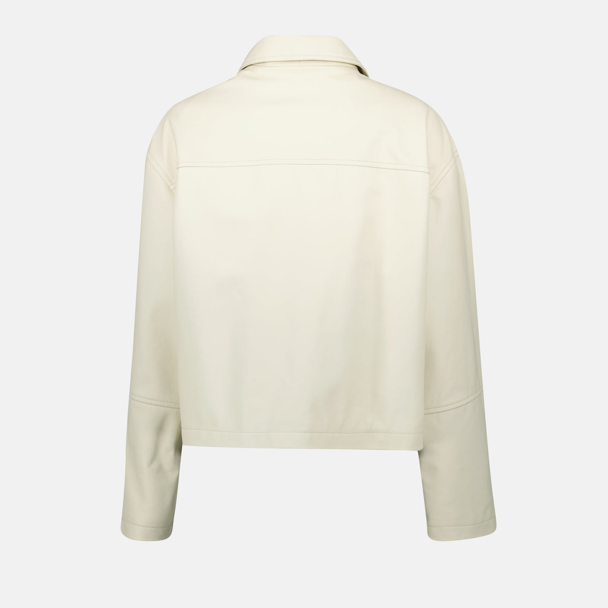 Off-white leather jacket from the brand Moschino, designed for women. This model is part of the Spring-Summer 2025 collection and features a chic style with refined details.