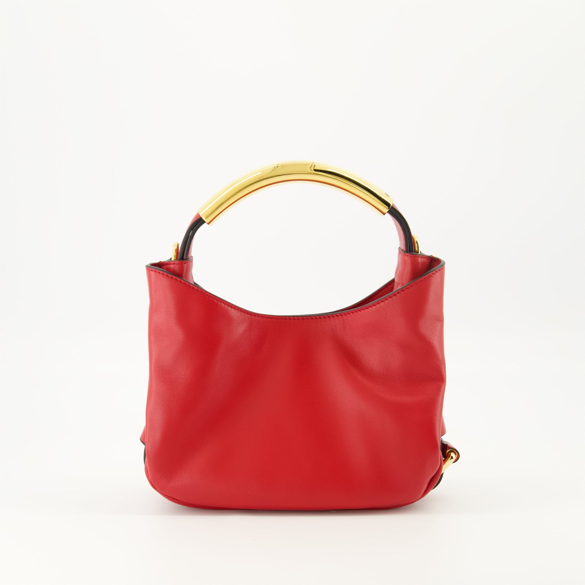 Red Handle Me leather bag from Moschino, designed for women, is part of the Spring-Summer 2025 collection. It stands out with its magnetic closure and removable leather shoulder strap.