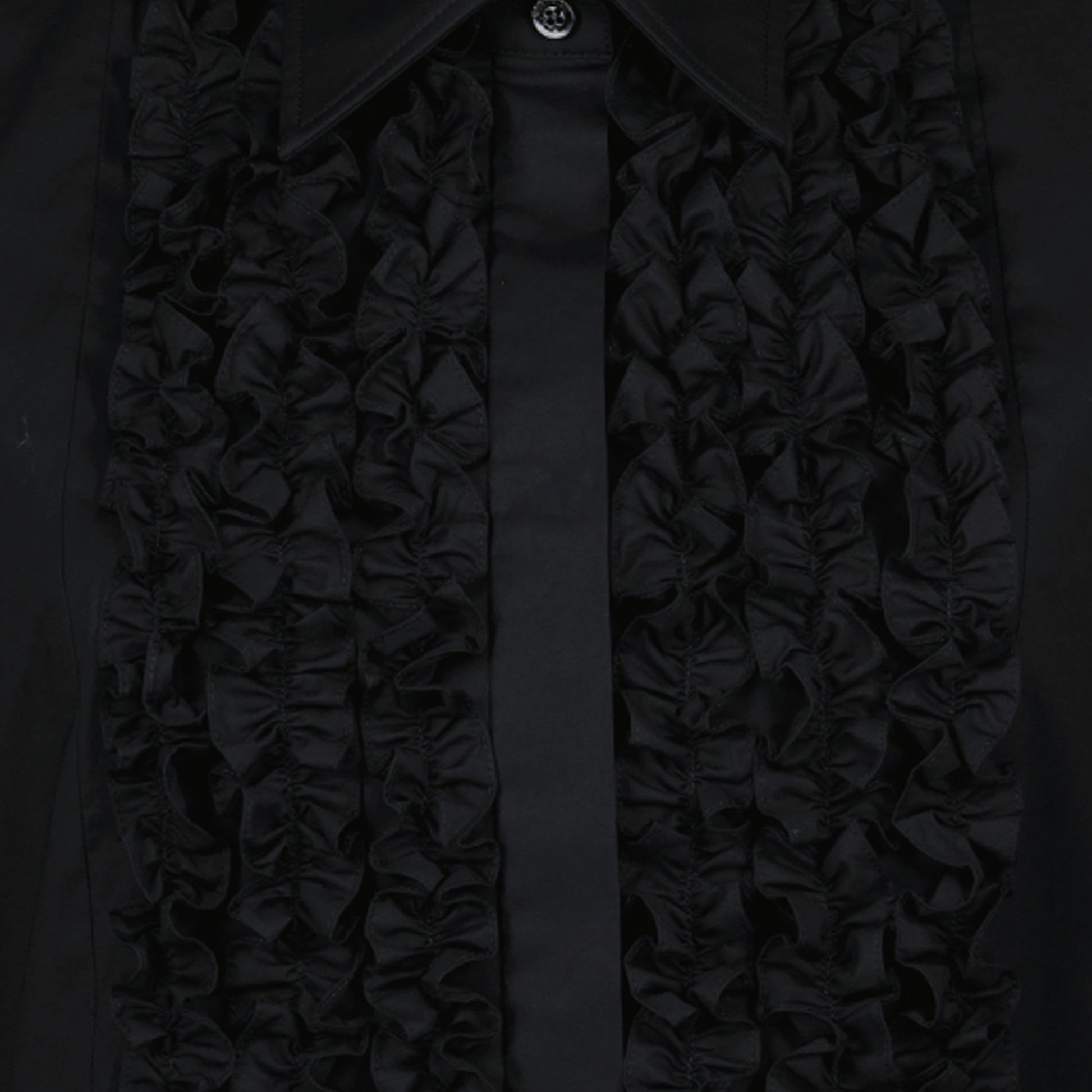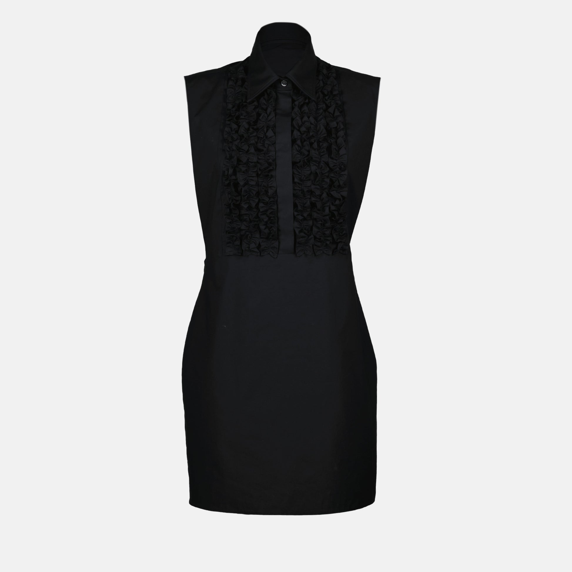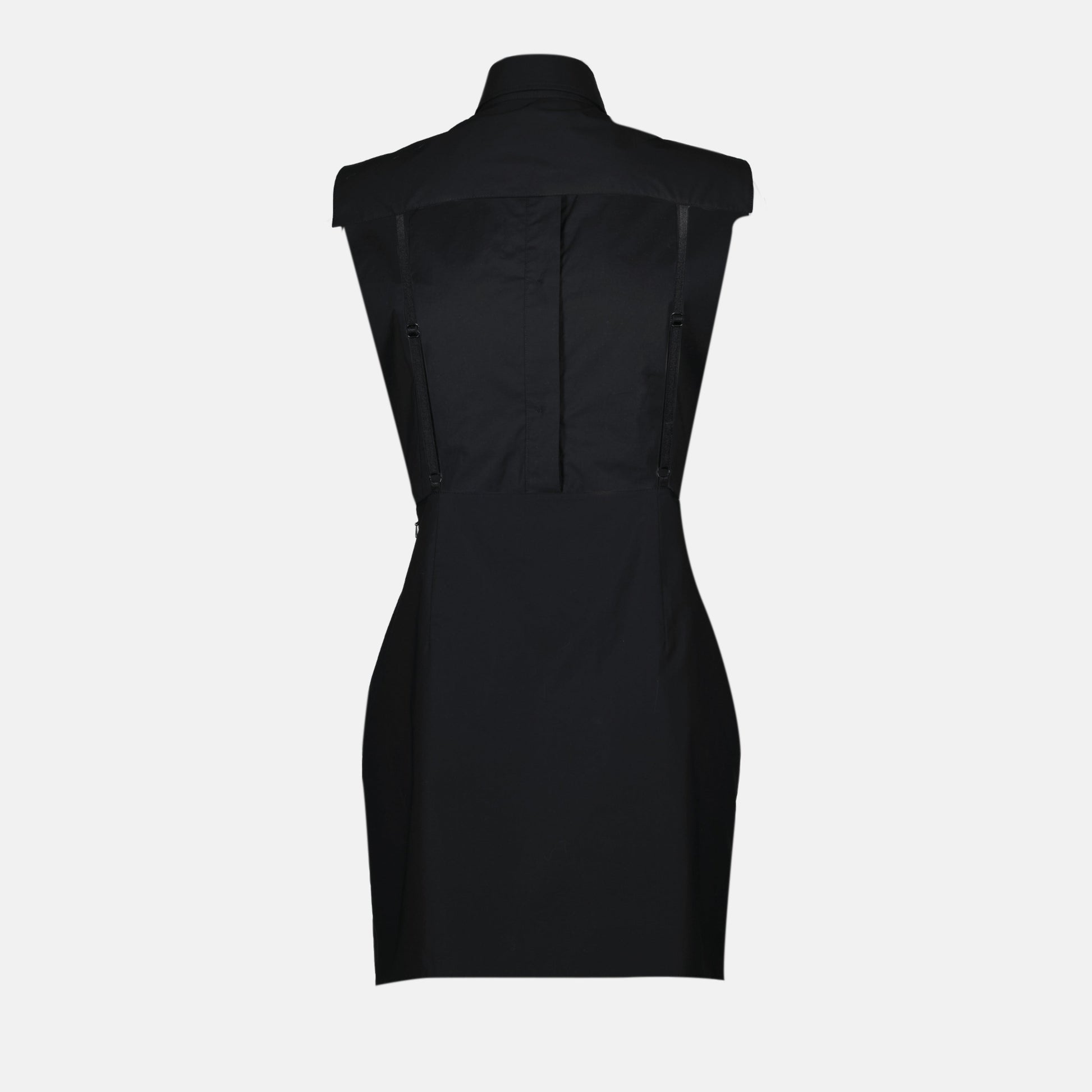 Black poplin dress from Moschino for women, Spring-Summer 2025 collection. It features a high collar, a mini cut, and ruffles at the front with a backless design and adjustable straps.