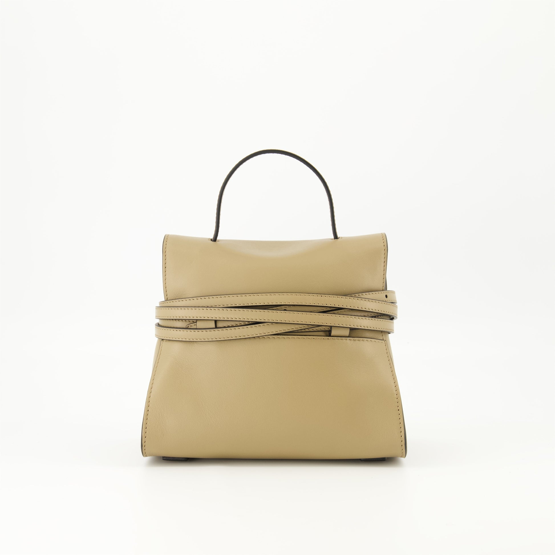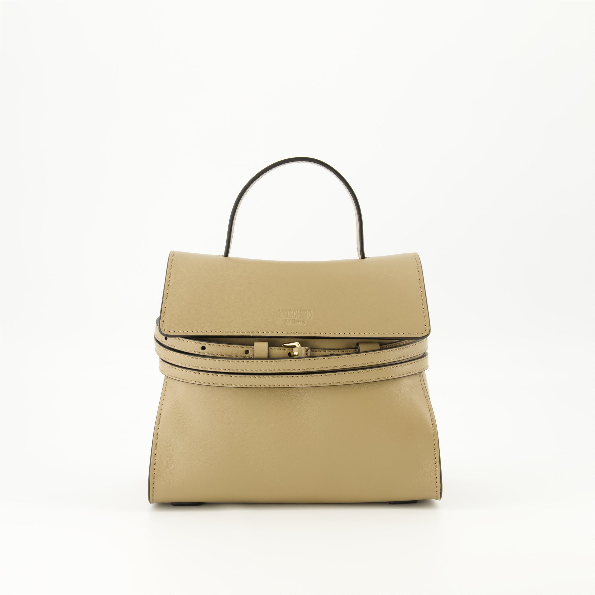 The beige Tie Me small bag from Moschino is a refined feminine accessory from the Spring-Summer 2025 collection. It is crafted from lamb leather with a cotton lining and is available in several colors.