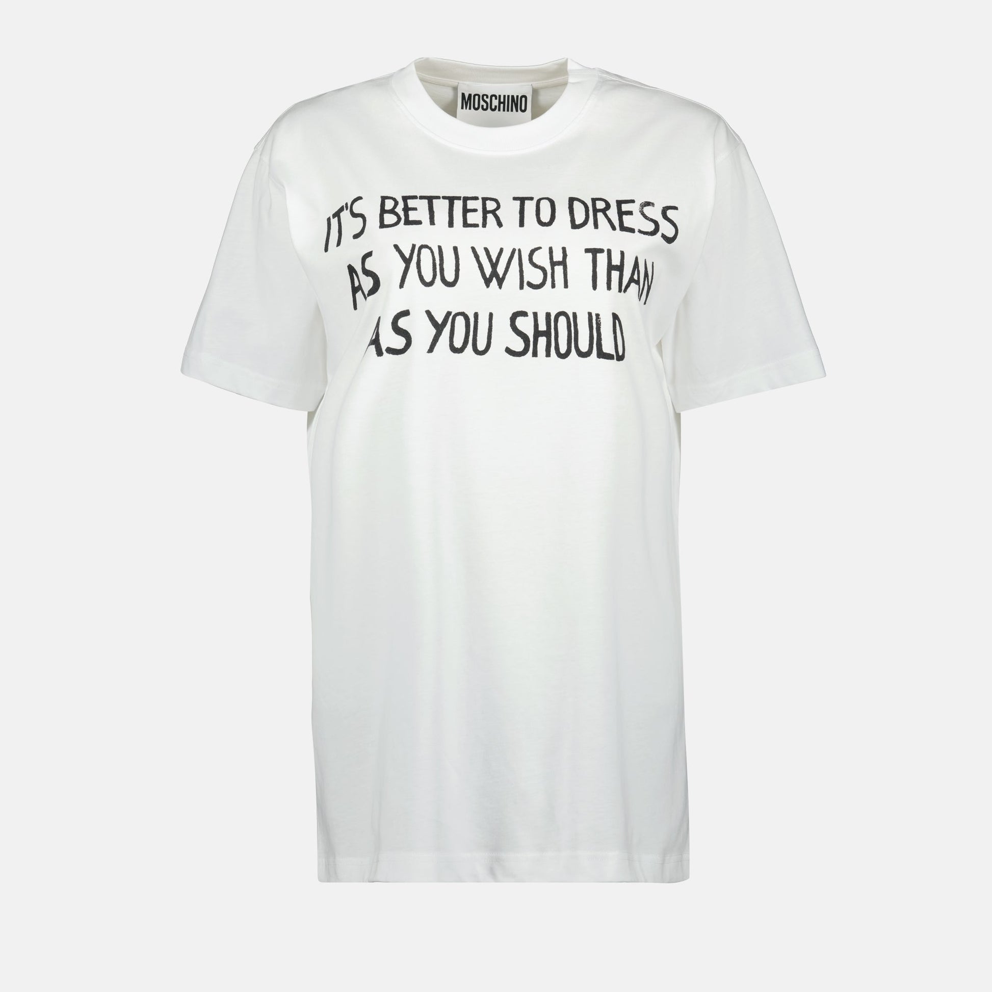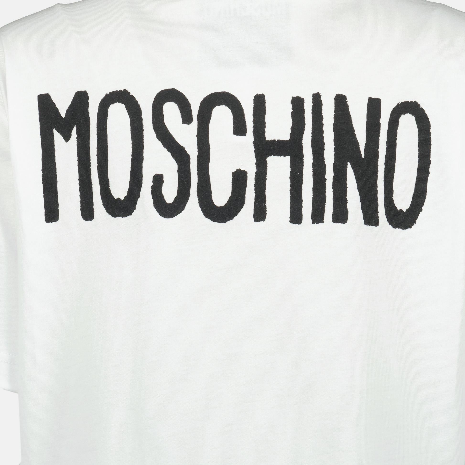 White Archive Slogan T-shirt from Moschino for women from the Spring-Summer 2025 collection. This cotton t-shirt features a round neck, short sleeves, and a slogan print on the front.