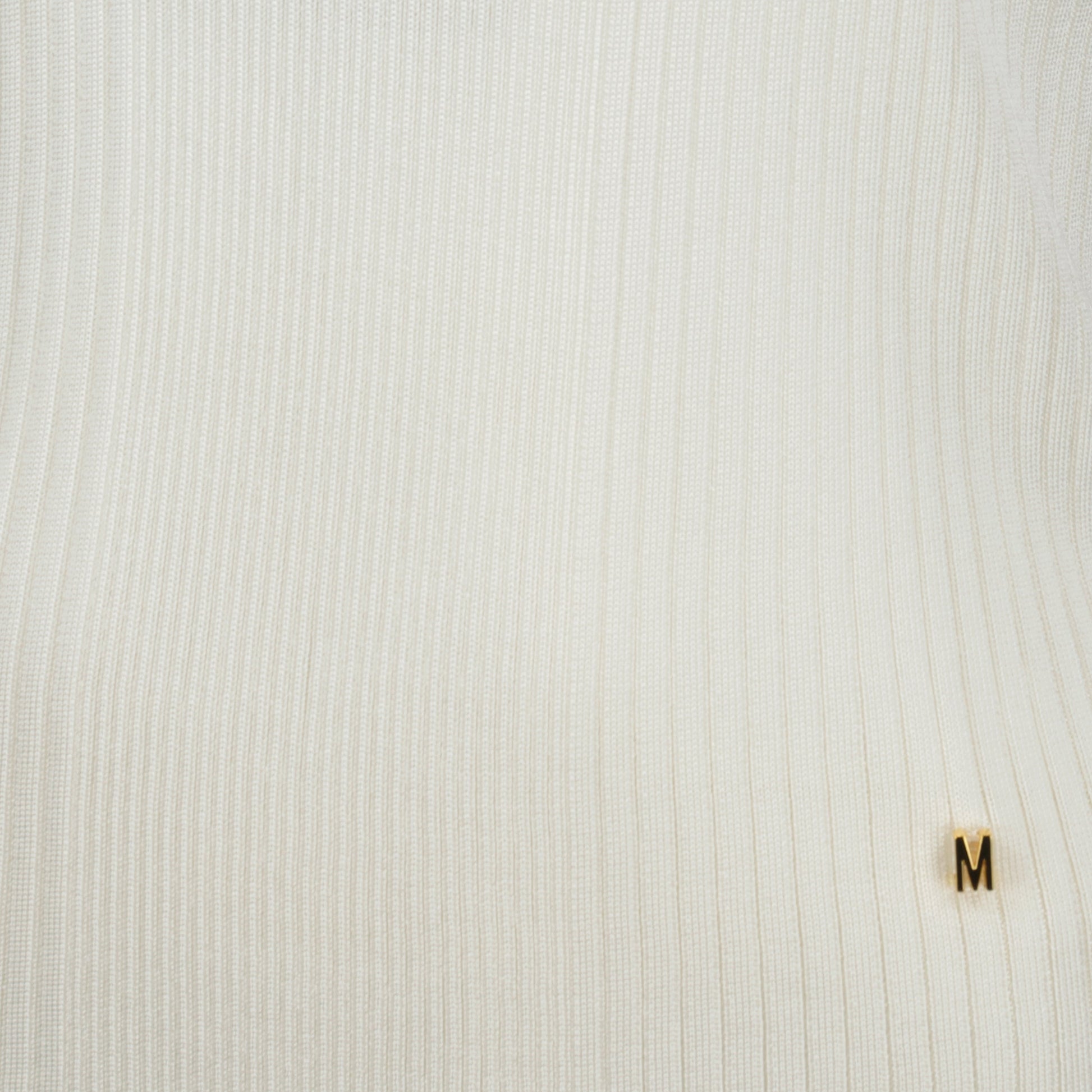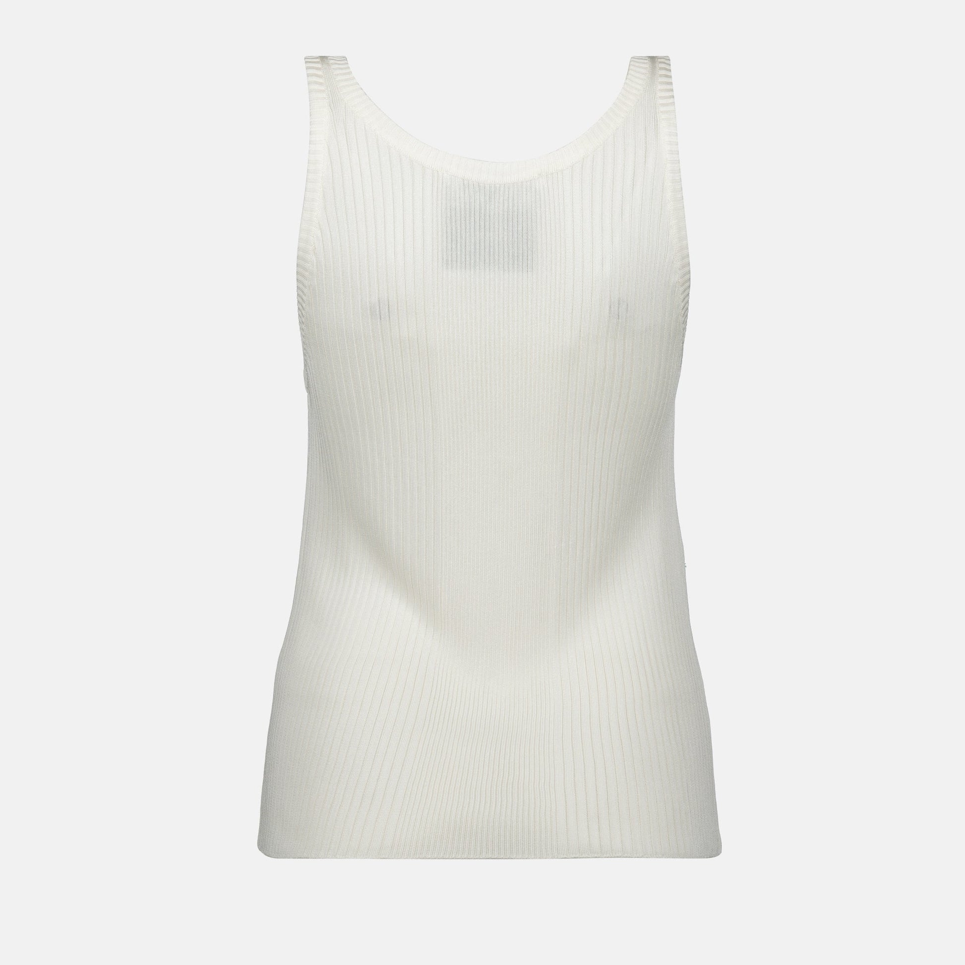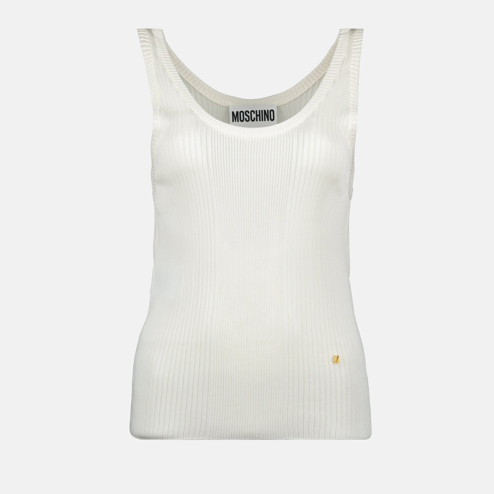 White ribbed top by Moschino for women, made from viscose with a round neckline and thin straps. This model is part of the Spring-Summer 2025 collection.