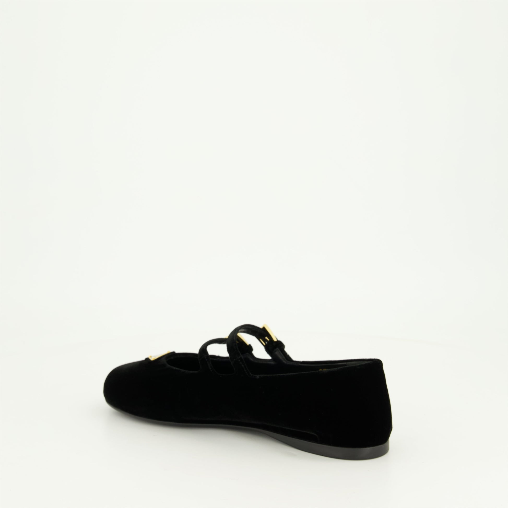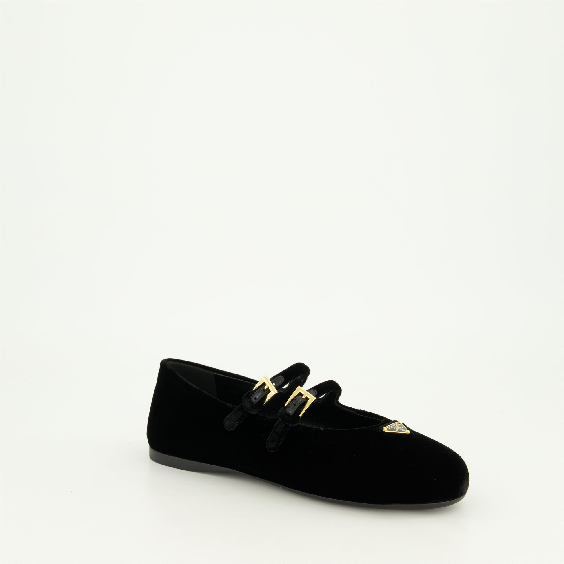 Black velvet ballet flats from Prada for women, Spring-Summer 2025 collection. They feature adjustable straps, an almond toe, and an enameled metal triangle logo.