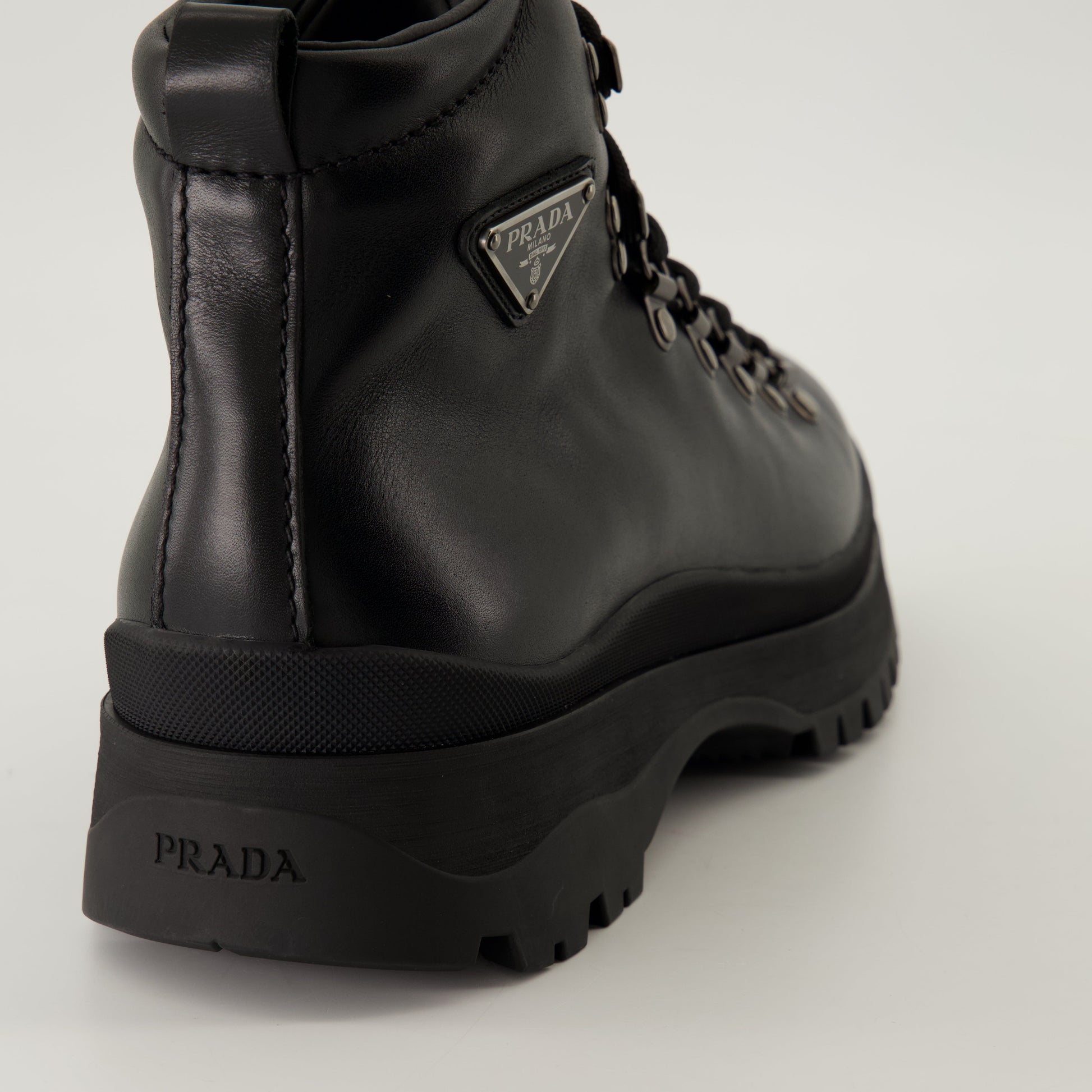 The Brixen ankle boots in black leather by Prada are designed for men. They are part of the Autumn-Winter 2024 collection and feature a high-top design with a rugged sole.